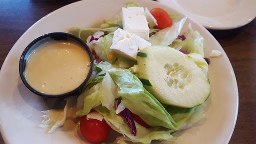 SIDE OF SALAD with honey mustard dressing. Iceberg lettuce, cucumber, tomato, olives, green peppers, onions, baby tomatoes, and feta.
