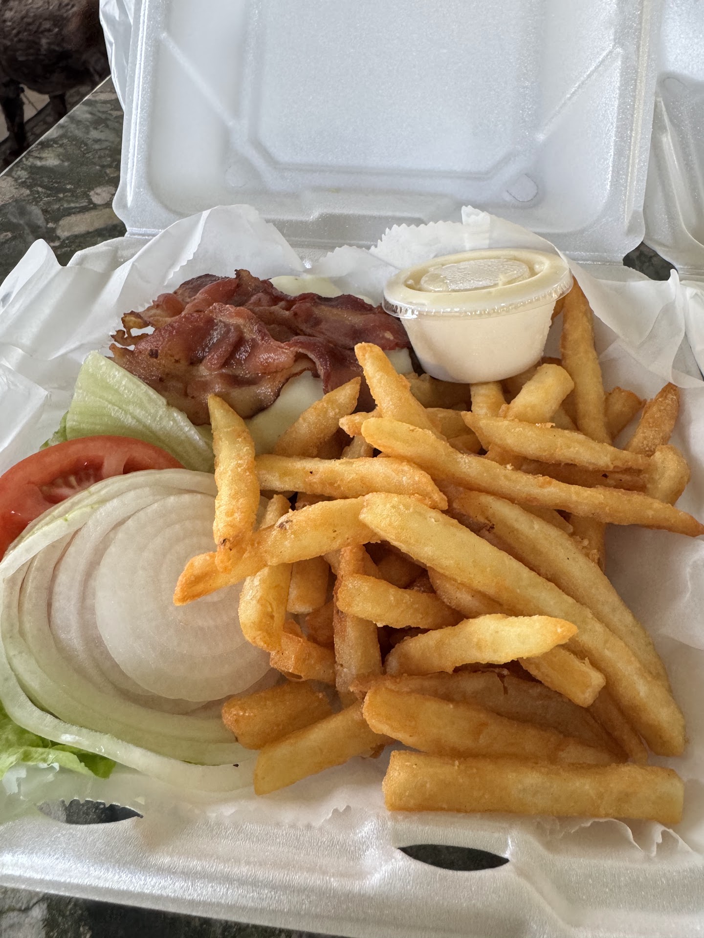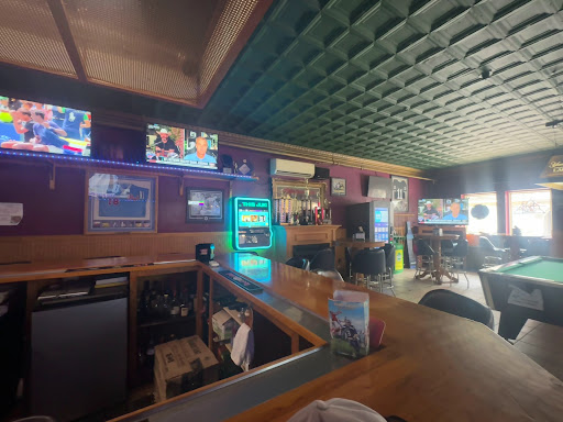 Local establishment with both food and adult refreshment. You can eat at the bar, but there is a small dining area separate from the bar area with an additional entrance. Public gravel parking lot across the street.