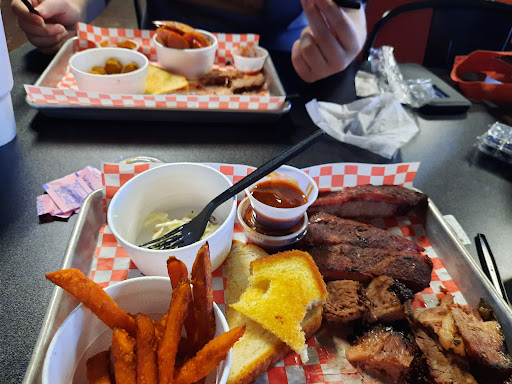 Read moreVery disappointed, we both had the 2 meat plates. My dtr ordered sausage and brisket, w okra and mac and cheese. I had brisket and ribs,with sweet potato fries and slaw. Then we were told they didn't have sausage due to a malfunction. All they had was ribs and brisket. No Mac and cheese either. Then were told would have sausage and Mac and cheese up in about 5 min. We sat down and waited for our order, the food came fairly quick but no drinks. Those came after another wait. No sweet and low for the tea on the tables so had to ask for that. Still waiting on the sausage and Mac and cheese. Finally the sausage came out, but had like cheese in it, and she said it tasted like jalapeños or something. While that's not bad if you expect it, she expected just normal.sausage. a note on the board that this was a cheese and pepper sausage would have been nice. Another wait and Finally her Mac and cheese came out. She said it was good but arrived after the meal. We decided to get the peach cobbler for desert to split, and while the plastic container said peach cobbler what it was was carrot cake. It was good but not made fresh,was a packaged product. The music was playing so loud it was uncomfortable and a blessing when it finally stopped. We both felt for the price we have had much better bbq...