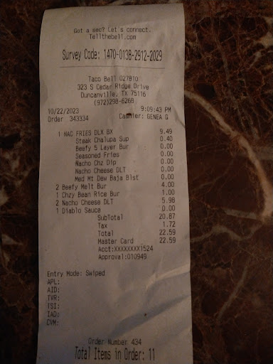 Read moreThis is bar none, the single worst Taco Bell that I have ever been to. It may be the worst one in existence. To say that a Taco Bell is bad is almost a truism, so you may not yet grasp the import of this rating. This place is horrible FOR A TACO Bell. The problem is not the extremely slow service (though it is the slowest), nor is it the broken down and poorly maintained equipment and furniture (though both the drive through and interior have significant problems). No, the problem is the food. I have never been here where I didn't receive at least one extremely stale tortilla, on more than one occasion the meat has been so bad that I threw it out rather than eat my burrito. Why do I keep coming back to experience such horrible service, environment, and food? Well, I have a short memory and this is the closest, most convenient fast food to my house. Half my reason for writing this review is to reinforce for myself that I must never...