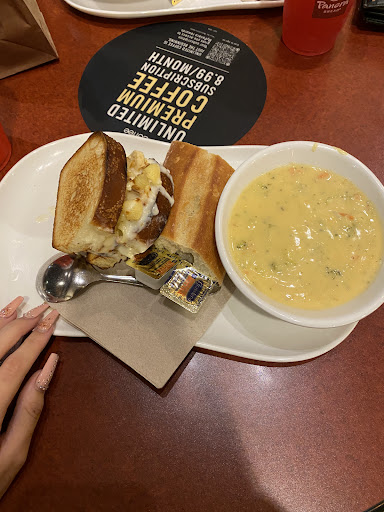 Panera is always a great visit. The staff is always nice but me and my boyfriend usually have a girl named Bryn, I think, who is so sweet and great to talk to. She remembers us when we come in, mainly him, and it makes the experience better. Pricing here is great. I feel like its extremely fair for how much and how good the food is. This visit I tried the grilles mac and cheese sandwhich with broccoli cheddar soup (a classic) and bread. It was absolutely delicious. Never had an issue with inside not being clean. It always looks nice and its a super cozy place to eat. Could stay here for hours infront of the fireplace with some hot soup and a book. Wait times arent long. Its pretty quick for how much food we usually get, and everything is fresh and hot when we receive it. The lemonades are amazing as well and I love just sipping random mixtures of that while waiting for my food. Overall its a great place and I never have anything to...