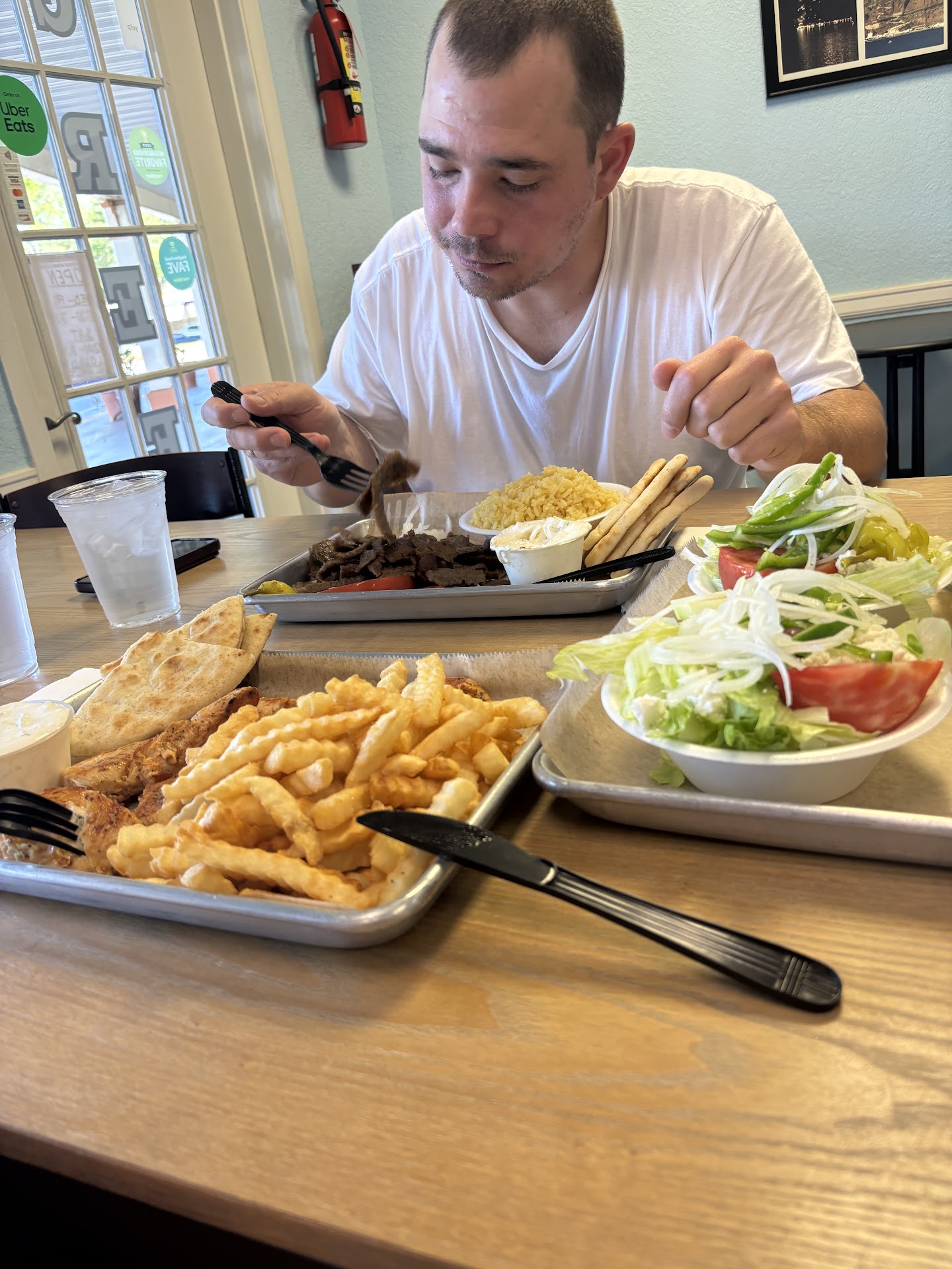 Read moreWow! What a treat that we don't have to drive to tarpon springs to get delicious authentic Greek food! We ordered the chicken souvlaki platter and two kids burgers and they were more then we expect it! The servings are huge, the ziki sauce is delicious (and huge, I ordered extra thinking I wouldn't have enough but I didn't realize how big of a container they give you) My kids couldn't finish the huge burgers and my husband and I decided to share the salad and save the other salad that comes with the platter for tomorrow. We are more than full and have dinner for tomorrow night! We're so stuffed that we don't even have enough room to eat the delicious dessert that came with it. I did try a couple bites of the cheesecake, which is probably the best cheesecake I've ever tried. The owner makes it homemade there. Which leads me to the fact that the owners a husband and wife are so kind and generous! It seems that they put their heart and soul into this place. We will definitely be back again and we will tell all of our friends about this...