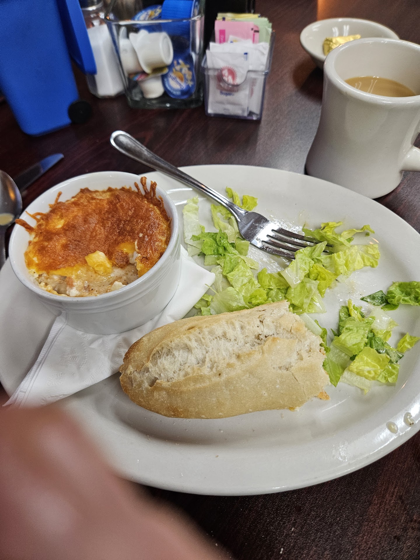 We chatted for a bit and I took photos. Shortly our meals came. I thought the Shirred Eggs would be scrambled but they were added to the bacon and heavy cream, unbroken, so cooked but juicy, and topped with cheddar. It was delicious. And the warm, toasted, baguette was superb.