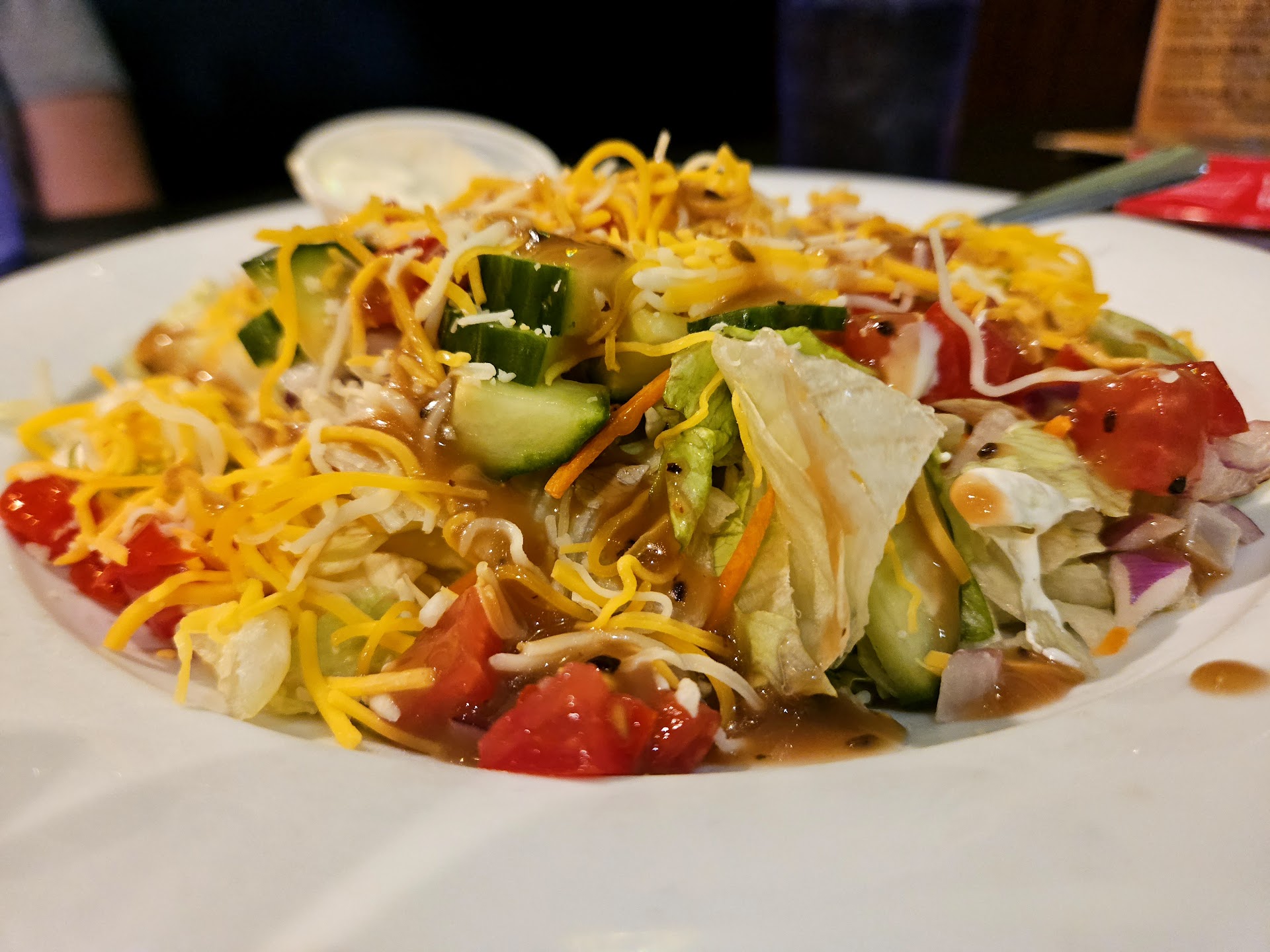 House salad on par with anything else out there from the average chain with basic dressing and bagged cheese and lettuce that beckoned to be just a little fresher.