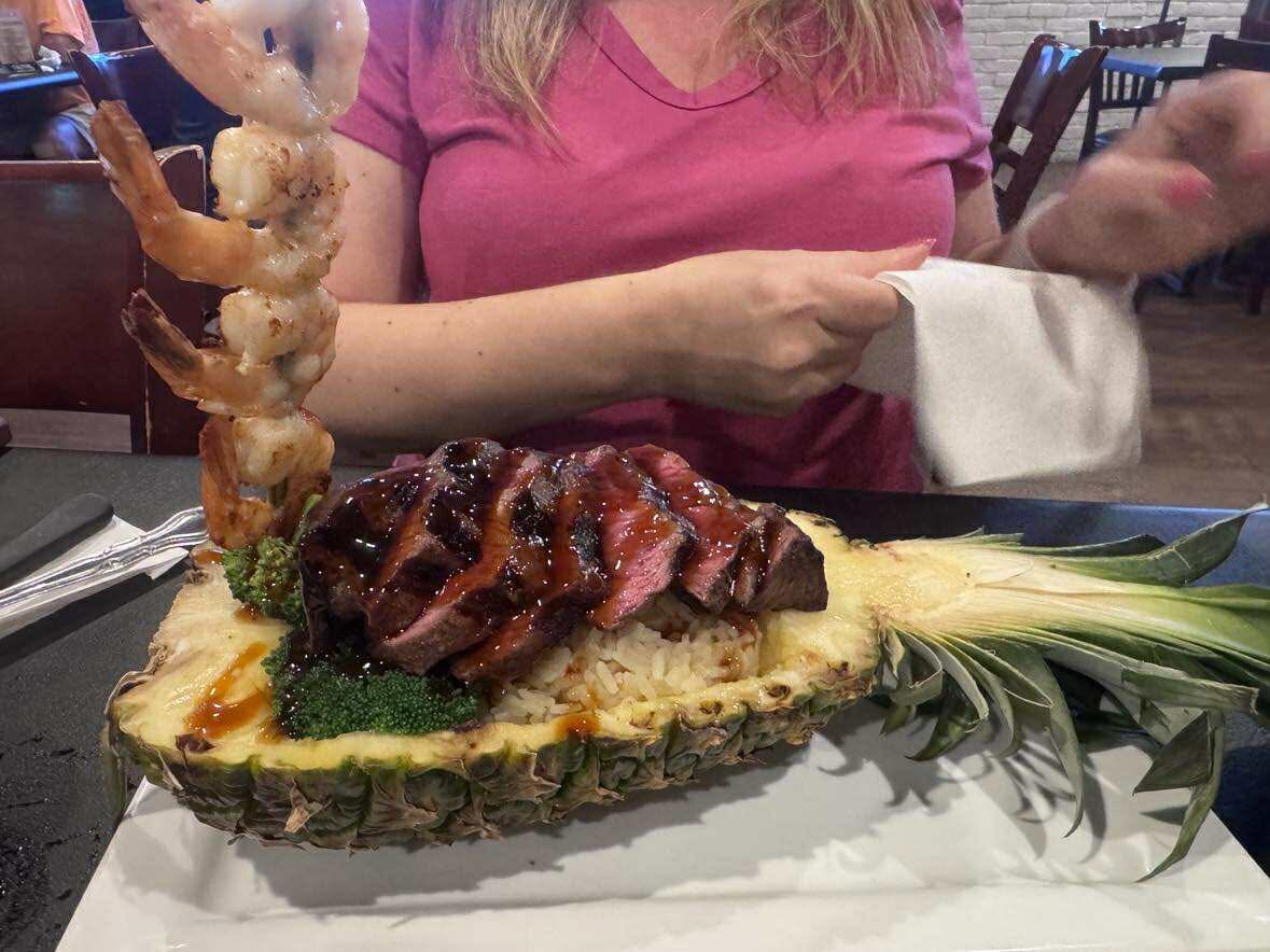 I am very happy to report Pineapple Jacks did not disappoint.. I had a blueberry mule make w blueberry vodka. It was very good and different, not too sweet either. We ordered the fish N Chips, replaced coleslaw w side salad. Even the salad was very good made w cheese, bacon, cucumber, purple onion, and homemade balsamic. The Fish was fresh and fries thick/crispy for only $16. Not to mention it was a huge platter. A Must have, the stuffed pineapple!! OMG coconut pineapple rice, steamed broccoli, sirloin steak, skewer of shrimp, and topped off w a teriyaki drizzle. All of it was amazing, steak not chewy and cooked to perfection. I don’t normally like rice too much but theirs was out of this world.. and was only $26..