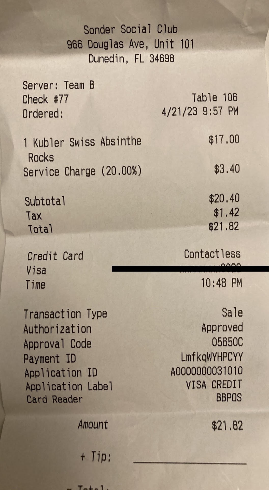 Read moreAdam, my waiter, was nice and helpful. Unfortunately he failed to mention at the beginning of my visit that this establishment charges a 20% gratuity automatically, irrelevant of how many people are in your group or what you purchase. My greatest disappointment and disgust comes from the drink that I was served and the amount that I was charged. Take a view at the receipt that Iâve published along with this, $21.82 for a shot of absinthe on the rocks. Let me be clear that I am in the city of Dunedin, which most people have never even heard of. Iâm not in Manhattan nor am I in Los Angeles where are these types of prices are a little bit more acceptable. The table next to me which was a group of four people also had a less than desirable experience and after overhearing some of the discomfort and drama I had to share my opinion with them of how management had treated them as well. I have also included pictures of the current menu and listing of prices. I had somewhat of an idea that my drink, which wasnât even an elaborate cocktail, would cost between $10 and $13. In this situation, Adam shouldâve made me aware of an inflated cost when the type of liquor I ordered isnât noted or listed anywhere. The least rating I can give this is one star thatâs too bad because they donât deserve one...