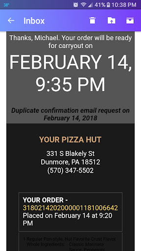 Read moreTHIS MESSAGE IS A VOICEMAIL TO TEXT, FROM PIZZA HUT IN DUNMORE, CHECK THE NUMBER! I HAVE THE ORIGINAL VOICEMAIL TOO! Police were called and informed as well. I paid online and did a no-contact delivery. They banged on my door demanding money I didn’t owe because everything was done online, however he stood out there banging on my door. At first I thought it was to let me know it was there, until he banged on the door again. My dog was barking and waking up people so I handed him whatever the girl at the store told him I owed, then when I looked over everything and seen stuff missing I called. Normally i wouldn't, but they made a huge deal for the money and didn’t give the product so I was obviously mad. The girl denied me a manger and hung up. I called 3 times asking and she said no and hung up. I decided I’d just call the next morning and talk to the manager on then. The girl working at Pizza Hut called me 40 minutes later when I’m sleeping because it was late, and left me this voicemail. I showed it to Ray the store manager and he said he couldn’t do anything and couldn’t even give me a number to call for cooperate. He said he would set something up. But I haven’t heard back and he’s avoiding me so I’m sharing this situation!! (It’s been a month. Ray had 1 month to...