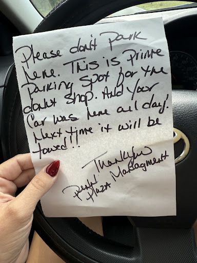 Owner places this lovely note on my car. I frequent this little strip every two weeks as I faithfully pay for and get service from Youtopia. It has been confirmed to me that this is an open parking, parking lot. Yet I am being told in this note that the spot I was parked in is for Go For Donuts only. Well I was informed by a few renters, that’s not true. The note also stated that I was there ALL day. That also isn’t true, my car was parked for 2 hours and 49 minutes(my maps marks it) AS I was paying for a service at the nail shop a couple doors down. My problem with this note is, you are threatening to tow MY car, in an open parking lot when I am a few doors down as I ALWAYS am every two weeks for being there for almost 3 hours getting a service I was paying for. I called and the lady I spoke too tried down playing it saying that her boss must've gotten my car mixed up with someone else’s. Then proceeded to state that the owner of the strip is crazy and her boss is probably just trying to make sure everything is okay for when he shows up and starts yelling. Maybe you should get with the owner and either set up designated parking for ALL the shops in the strip or stop threatening people with the one thing that puts food on the table for their children for absolutely no reason. I do not leave reviews especially bad or distasteful ones but for some reason this struck a nerve and I felt the need to actually leave a review this time. Which says a lot. I hope you all have the day...
