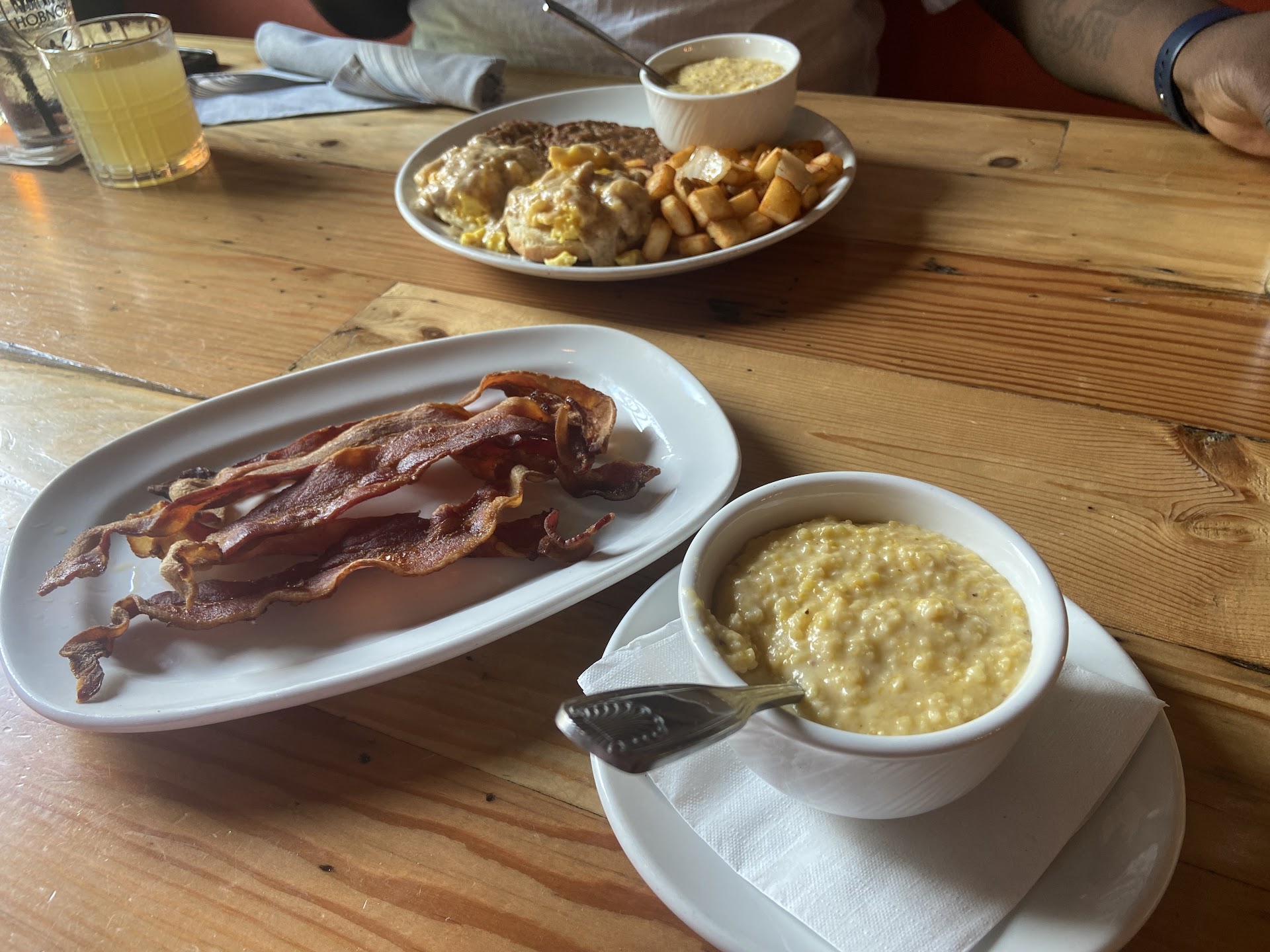 As it is super hot outside I didn’t want to eat too heavy, I decided on two sides of Bacon and the Cheese Grits.
