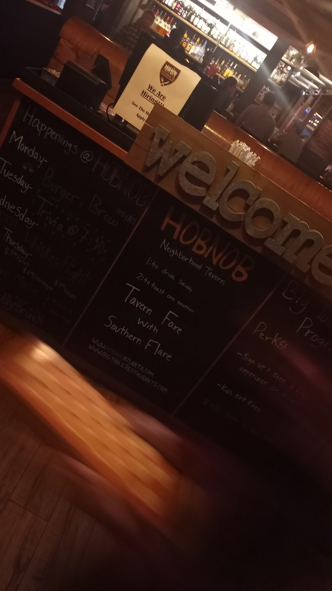 Read moreWent for dinner at this location on a Saturday night. It was pretty crowded, but but the time I got there, there was only a 15 minute wait..and that's just about how long I waited to be seated. The hostess was professional and knew what she was talking about when I asked a couple of questions about the food on the menu. It's always a good thing when the employees speak well of the food. I must mention, while waiting, I noticed a wall with shelves and they were full of family games which you can take to your table to play. Genius. Maybe this was why there was a wait. Lol The very large restaurant was clean, and you could see the professionalism that all the employees worked with. The bar tender had his customers laughing and enjoying themselves at the bar. The waitress that waited on me..whose name was Ashlee, was top notch. I knew she may have been tired because I heard the restaurant had just been slammed with customers, but Ashlee did not show me any less service. She was efficient, knowledgeable about the food, patient, and I was impressed at the fact that she was able to balance a ton of drinks on one tray. lol I truly know she definitely was experienced, courteous, and provided service with a smile. I ordered the buttermilk fried chicken fingers, cider collard greens, loaded french fries, and a sweet tea with lemon. Y'all that food was good. Everything was fresh and I ate until I got full. Lol Ashlee was kind enough to bring me a to-go box and offered me a sweet tea to go. I would recommend this location of Hobnob to my friends. Next time, I think I'll try the shrimp & grits....