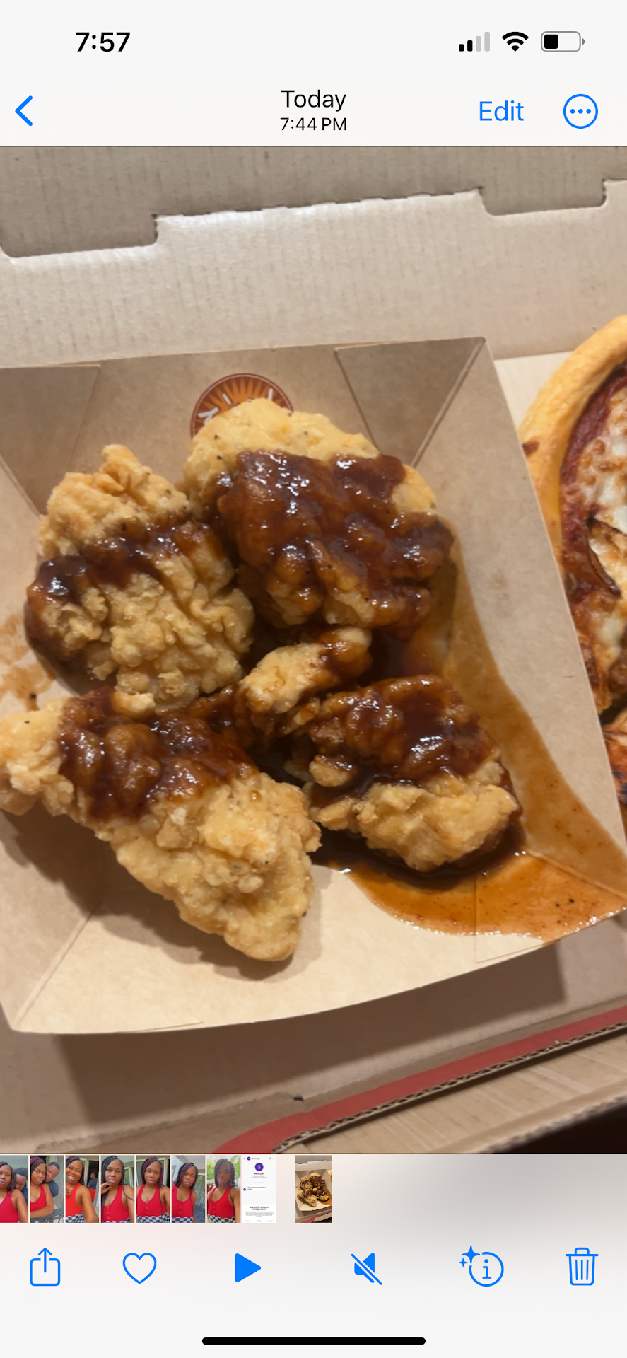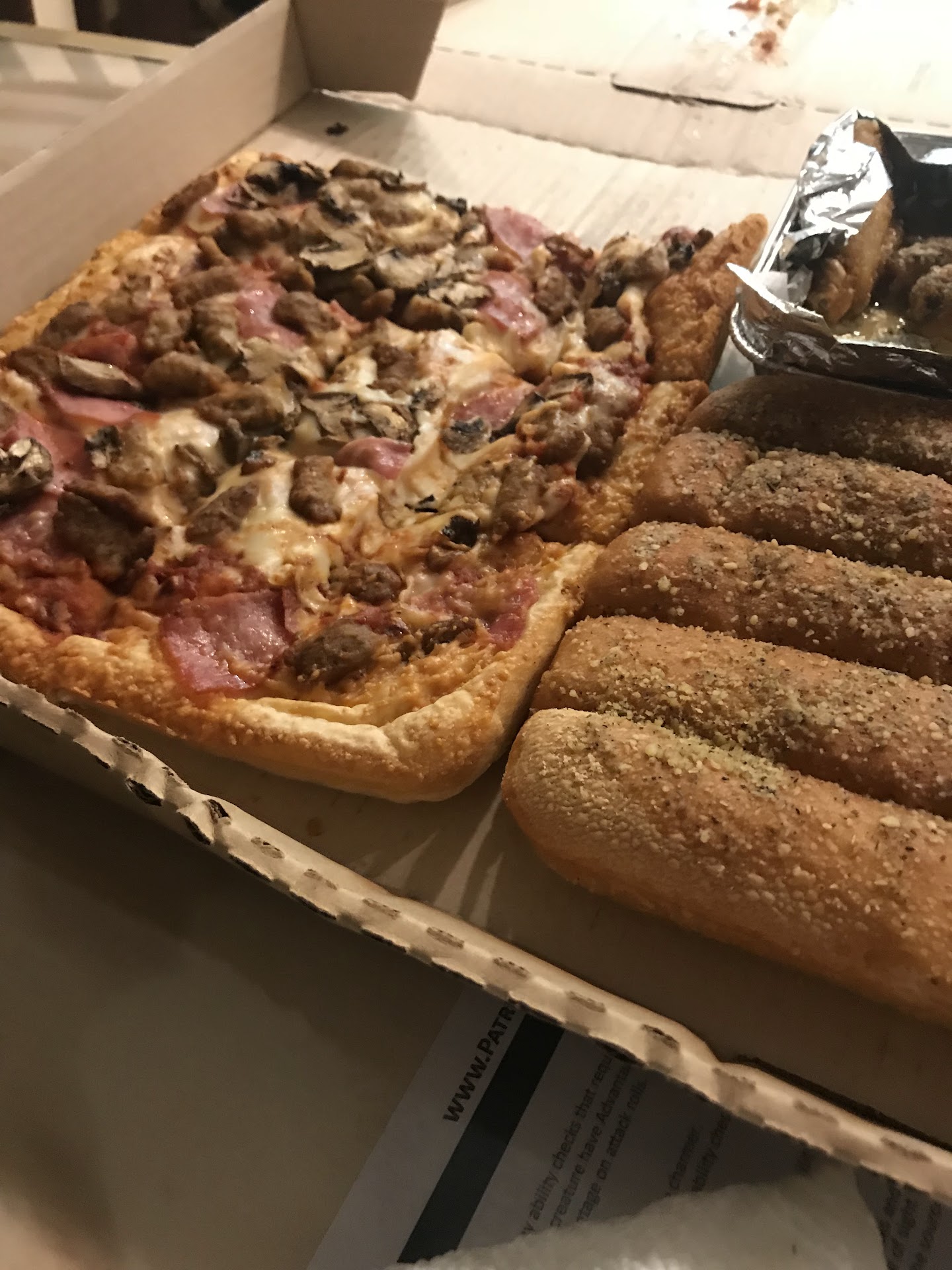 After the new one arrived, we opened the new pizza, and it was still very greasy but was at least not smooshed. We began eating the pizza and began to realize that it was gooey and not cooked on the bottom of the crust. It was sticking to the box, and the crust was not cooked at all.