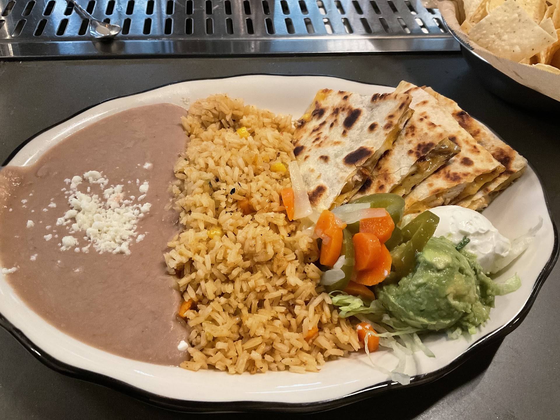 We started with the chips and dips, served atop a practical lazy Susan. The chips are very unique because they are a lot lighter and crispier than other restaurants, and the dips are fresh and popping with flavor. The red one is suitably spicy and not âdumbed downâ for American palates. The green has a very refreshing avocado taste.