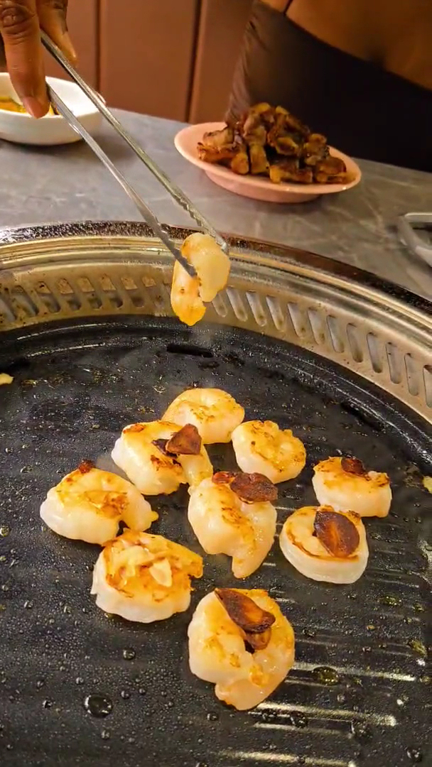 After just an hour we were STUFFED. We had LA galbi short ribs, New York strip steak, filet mignon, beef bulgogi, spicy pork belly, Cajun shrimp, fried dumplings, kimchi rice and then sides from the conveyor belt (items with the * were my favorites). Most of the proteins are seasoned, but I can definitely see someone wanting to bring their own from home too. Nick changed our grate out a couple times so we wouldn't be cooking on any burnt pieces left behind. Also a little hint, let the grate heat up before you put your protein down, that way whatever your cooking doesn't stick when you're ready to flip.