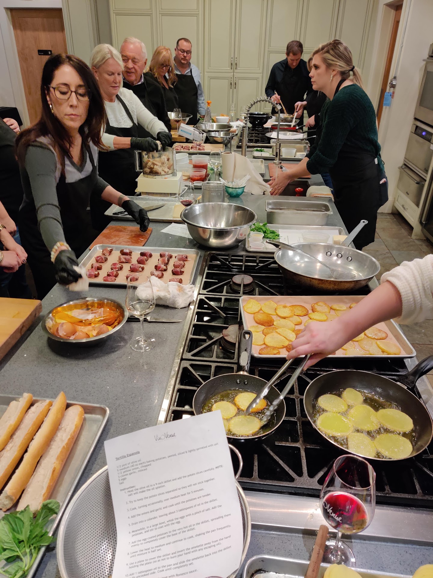 She handed out recipes - told us to pick which food we wanted to prepare and that the ingredients were pre measured for us. Meanwhile the wine girl - just kept wanting us to drink more - many of us had to continue to refuse her wanting to get us "toasted" #1 - the recipe had numerus mistakes #2 - the ingredients were not measure correctly - for example - not enough broth to cook the rice, we were told to just eyeball a few other ingredients - we made a chicken dish - and it did turn out good because my son and I know how to and like to cook. We did not get to experience prepping the entire meal - this was disappointment. the recipe for the salad dressing that was made by someone else - had no flavor - we had to add a lot to it to then make it good. Black bean soup recipe was...
