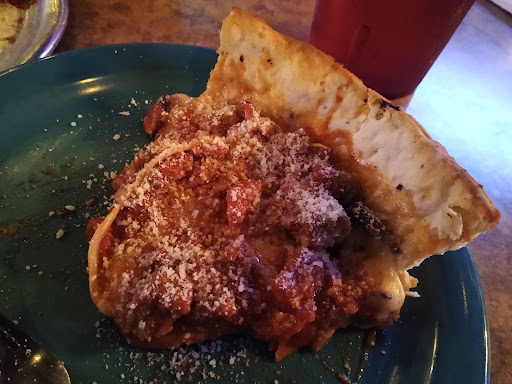 Now let's talk about the Pizza. We ordered a classic pep/sausage Chicago Stlye deep dish. To be completely honest, it was missing a little depth to be considered a real Chicago Deep dish. But still looked good non the less. The crust had good texture given the amount of cheese and tomato sauce that is needed on a deep dish. Basically, the crust wasn't saugy. The Pizza overall had good flavor. I would contribute that mostly to the flavor of the sausage and cheese that they used. The crust didn't have much flavor when you compare it to a Lou Malnatis buttery crust. I would definitely recommend over Pizza Hut, Papa John's or those other places that have...