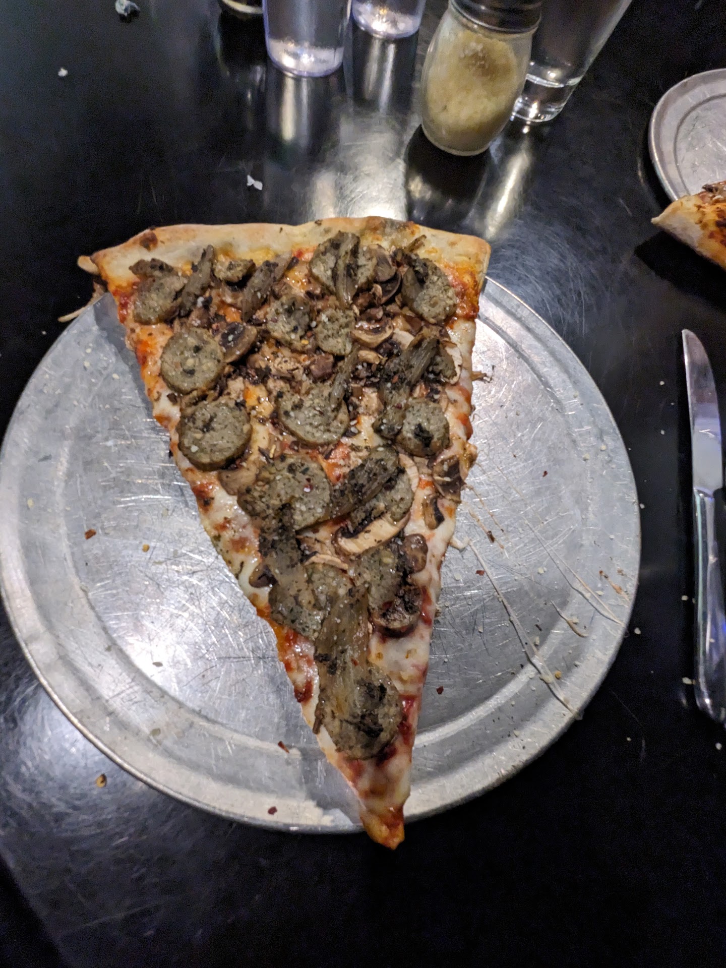 We ordered individual slices, they're quite large. When the pizzas finally came out they were decent. I got the Wise Guy, which was basil, meatballs, mushrooms, and roasted onion. The pizza was pretty good, but had some . I didn't really pick up any basil or onion. The sauce was quite salty and the crust was a bit soft in the middle of the slide. My wife got ricotta on hers and it mellowed out the sauce a lot. My son got ravioli and loved it š