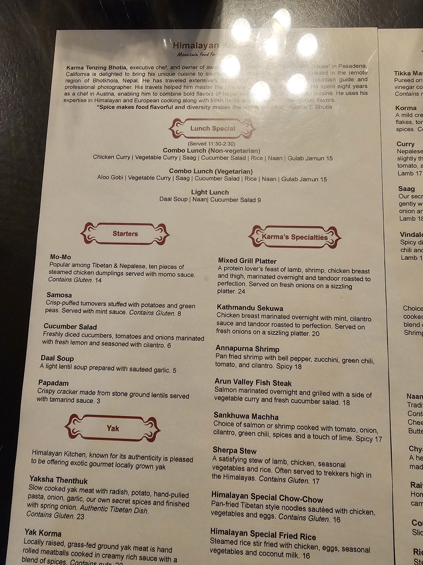 For dinner, we had the Sherpa Stew, Yaksha Thenthuk (yak stew - you have to order yak when it's available, right?), Chyamtange Dhopzi (like a whole wheat naan), and raita. My wife really enjoyed the Sherpa Stew. It tasted essentially like a good curry. The yak stew was good, though the yak was chewy for some bites. It was hearty - really like a good beef stew. It did need some salt.