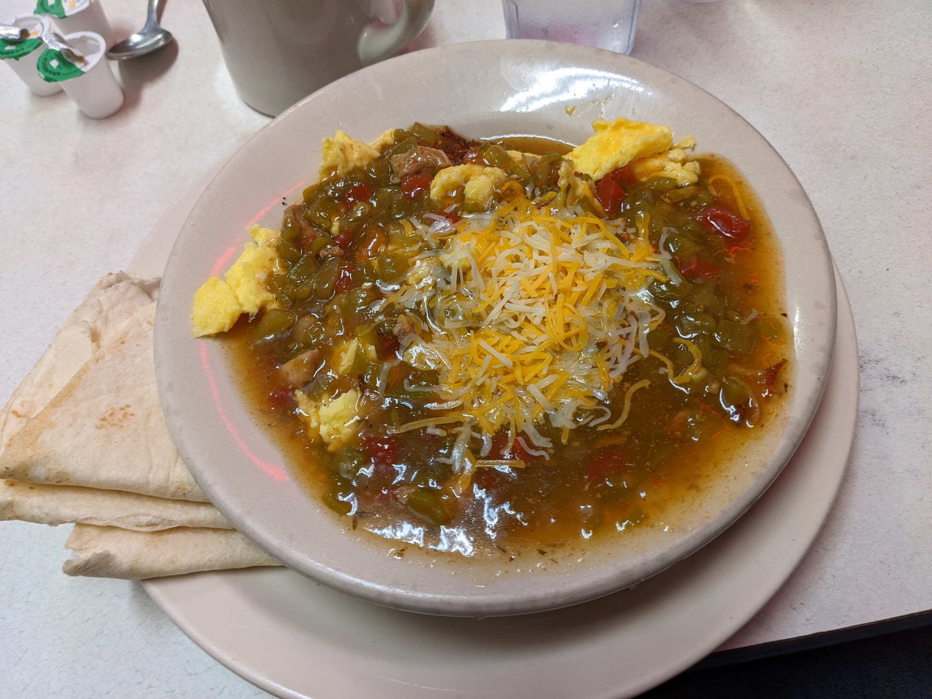 I got the verde plate, with 2 scrambled eggs, hash browns, green chili sauce, and a tortilla on the side. They smothered it, which made the hashbrowns soggy. The green chili sauce was quite good, and could hold its own as a stew. The tortilla was ok, but probably not homemade. The kids' pancakes were fluffy and unremarkable.