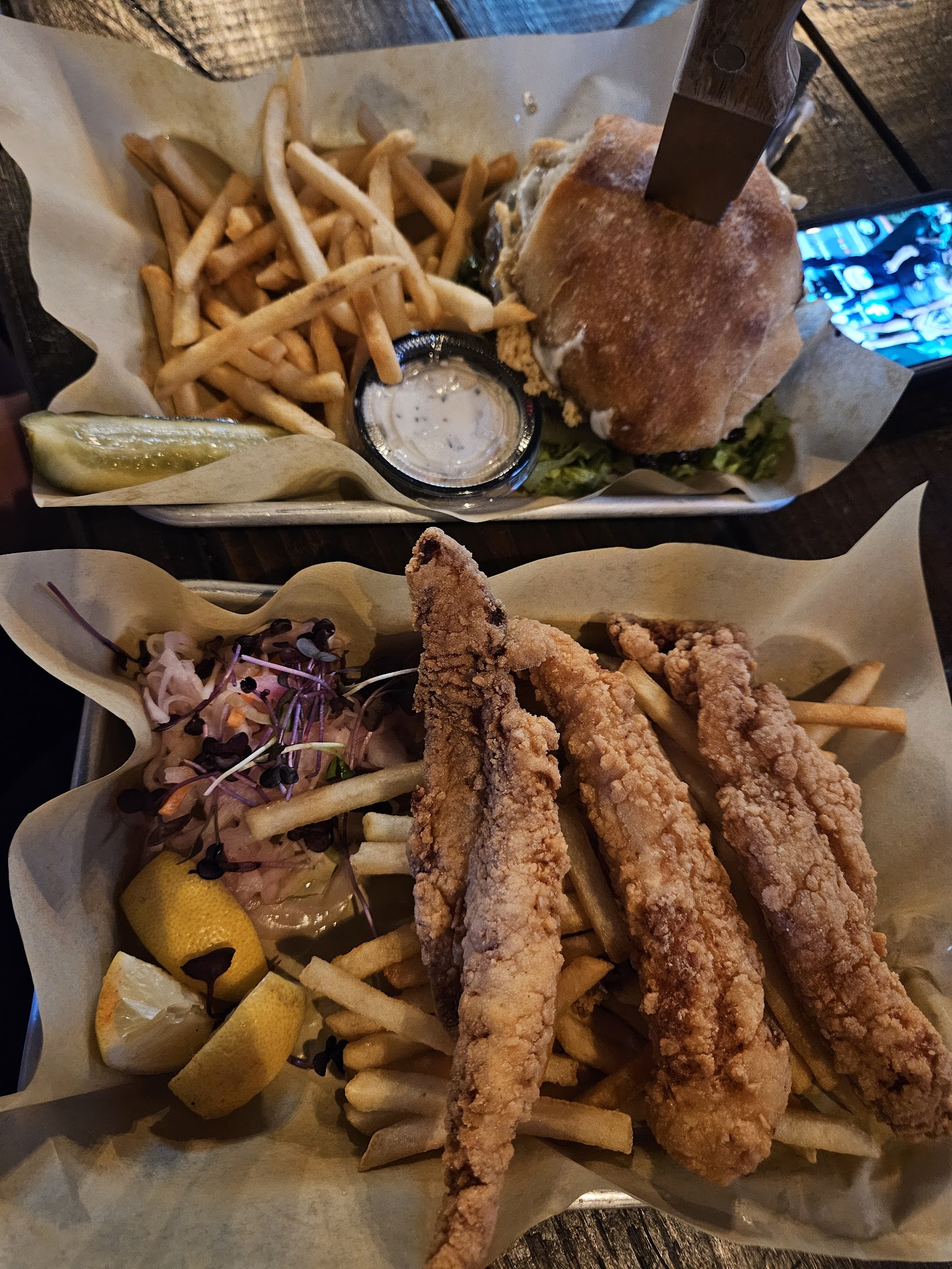 Overall, it felt very pricey for the quality of the food we got. Most dishes are more fastfood like than gastro pub. Expect to pay almost $20 per dish with suggested 20% tip even though you're ordering food at the counter and getting a buzzer for it (to me this just devalues the work of actual waiters who actually take orders and bring food for the same commission- bring up the price of your dish and lower the tip if there's no service). We ended up paying about as much as what we pay for sushi in town, but for fried food and frozen fries. The fish strips were about quarter inch thin- the thinnest I've ever had them by a large margin, and were a lot more fried batter than fish. For $18 I found that somewhat shocking. The fried chicken sandwich was pretty dry in part due to the chicken itself, bread used and lack of sauce. It paled in comparison to another good chicken sandwich not far from there.