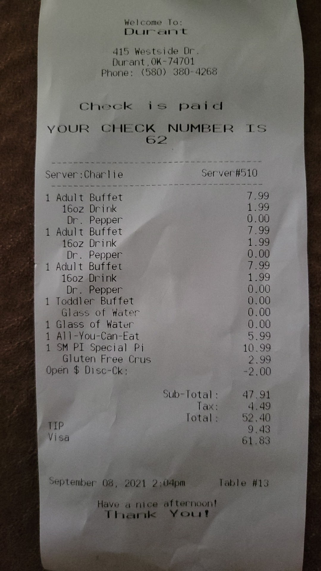 I'm only being generous w/2 stars b/c they at least mail out coupons and the gentleman at check out was Very kind! The dark headed woman that was our waitress did not provide the greatest service, or was she clear or honest w/answers to questions. I can't eat buffet food b/c of my gluten allergy. I wasn't very hungry anyway, I mainly wanted to spend time w/my children & granddaughter and buy their lunch. I specifically asked if they had ONE trip salad bar. If they didn't offer ONE trip, I wasn't going to eat. She told me, YES. I said, I'll have the ONE Trip Salad Bar then and a water. I had a very small salad and nothing more. Toward the end of eating, my daughter asked if they had an apple dessert pizza coming out, or if they could make one. The waitress said, YES. At that time, I ordered a Gluten Free Supreme Pizza to go. She asked if it would be on 1 ticket and I told her yes. She brought the ticket, which showed an ALL-YOU-CAN-EAT Salad Bar $6.99! She clearly could have told me that they did not offer ONE TRIP! She also could have let me know that I could go up there MORE than ONE time, since ONE Trip wasn't an option, but it wasn't until I asked about it on the ticket that she said, "We don't have a 1 trip". The ticket showed 1:36pm, which was shortly after ordering the apple & GF pizzas. Part of our group HAD to be somewhere at 2pm, so at 1:55p.m. they gave up on dessert and left. A couple of minutes after 2pm, the waitress went to a table beside my 1 daughter & I that had been just waiting and I asked if the GF Pizza was ready. There were only 3 tables w/people, so they were NOT busy! Across the restaurant, she said, yeah it's done. We went to pay. The GF Pizza wasn't at the register either! The man went looking for it. He said, I guess she was taking it to your table & didn't know where you went. My GF Pizza was near her clean up sink and she watched us stand up & go to the register! On the screen, while paying with my card, set tip amounts came up and I did NOT want to leave any of those amounts, so I chose OTHER. It automatically gave her an 18% tip of nearly $10!! The receipt shows the Server as: Charlie, but I don't know if that's actually her name, or the very kind man that checked us out. At home, I opened the Pizza box and the pizza that we waited 45 minutes for was burnt!! No one ever got any apple dessert pizza either. FYI: 1yr olds are considered Toddlers, so just in case she was only $0.00 on that specific day, just a heads up, because that waitress put the baby as 1 Toddler Buffet & Glass of Water (b/c we did get her a water). I feel like that waitress made our experience very different from what it could have been and I was very frustrated that it cost $61.83 for we 4 + little one to have...