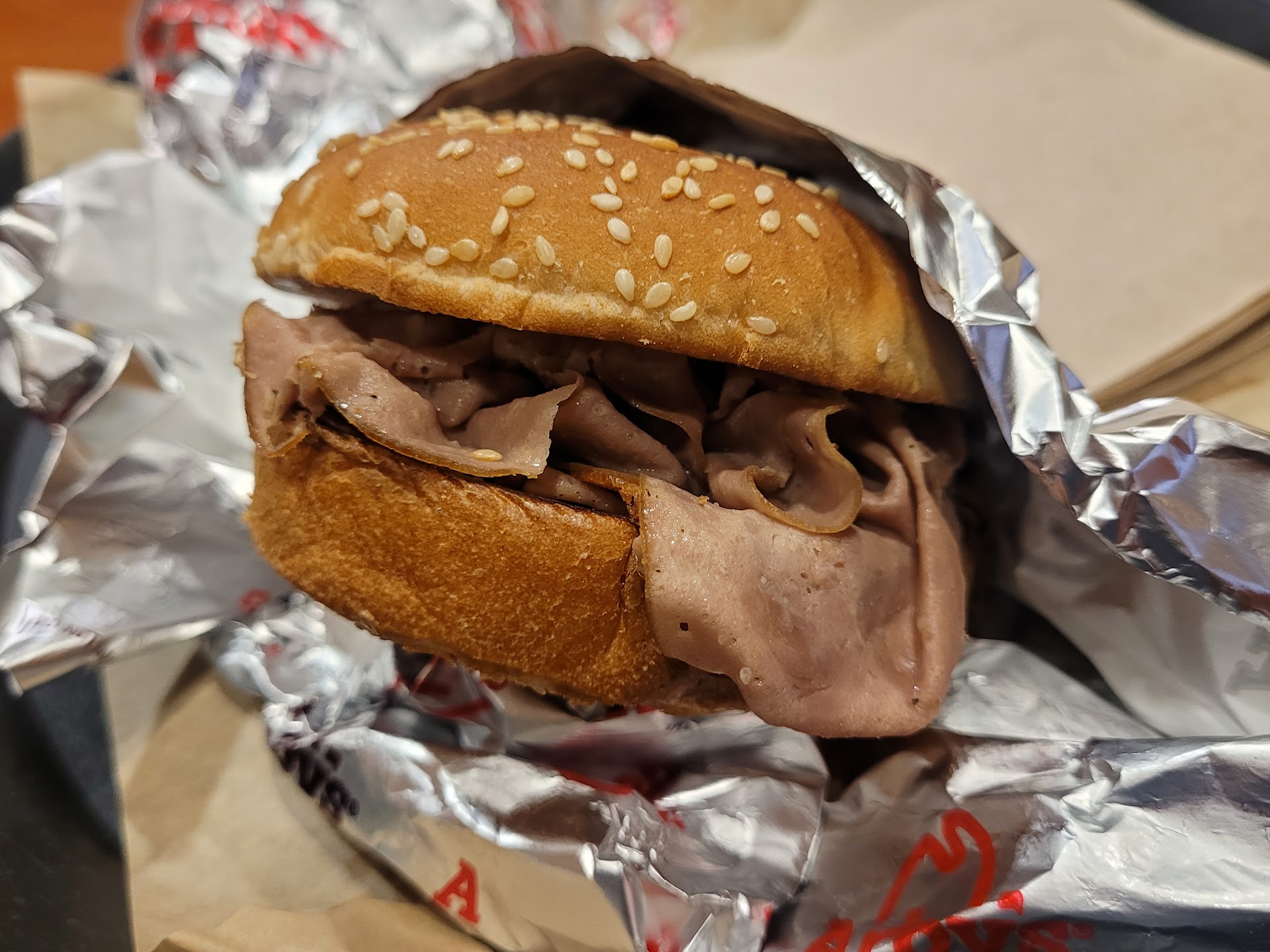 Read moreI had not been to Arby's in years and it is not a particularly common staple restaurant in the Bay area so I don't find myself with the option for it too often. On my way home one evening I decided to stop in on one purely on a whim. After looking over the menu for a bit I decided on the barbecue bacon sandwich which I believe was a roast beef sandwich. After taking the sandwich home to eat in the comfort of my own quarters I realize that they had neglected to include the apple turnover that I had ordered with my sandwich and called the restaurant to let them know. they were very polite about it took my name and allowed me to come back to pick it up at a later time which I did. As the writing of this review I can say that the apple turnover was indeed tasty and worth the return to pick up. The sandwich itself, was surprisingly good. The barbecue sauce did not appear to be overdone or drowning of the meat. The bun, which I am generally worried about some fast food chains because the breads tend to overwhelm the meats, was quite soft and did not overpower the sandwich itself. I came away from that experience relatively impressed, and although I am not rushing back to Arby's to either have another one or two try something different should it be a recommended stop in present company I wouldn't turn my nose up at it and would be willing to try more...