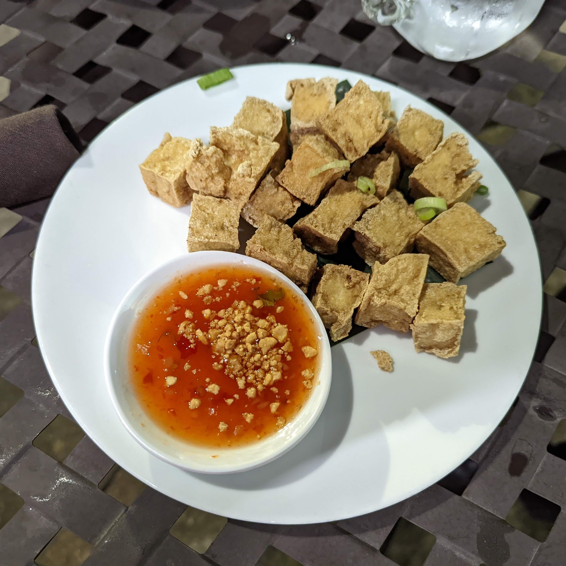 I ordered the Massaman Curry with Fried Tofu in a coconut milk (cream sauce ?) which included potatoes, onions, cashews and other spices. I told our server I donât eat as spicy, so she recommended to order the dish as it comes (mild).