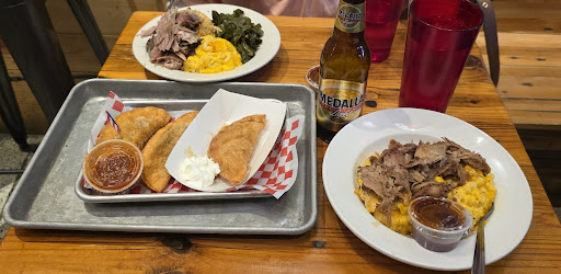 MY OWN EXPERIENCE TODAY!!! So I CHOSE to go with my daughters to lunch here bc they've been several times. It started out friendly and cool. The person taking the orders is super friendly (nothing against him) He turned on the heat lamps outside for us. He is very pleasant. Okay, so we get there around 1, order our food, only one person gets their order, pretty quickly may I add. There weren't many ppl there, AT FIRST. The ppl that were there were already serviced. We're outside, then here comes this HUGE crowd of ppl, so we go back inside. Still waiting on our food, meanwhile, one of my daughters food is getting cold bc she's waiting on us to receive ours. I told her just go ahead and eat her food. No one has come to us to let us know anything. I sent my daughters to ask about our food bc at this point we're nobody bc of this group of ppl that came together. They were served outside like it was a restaurant, given drinks and about to receive the orders they placed by the female owner. So when asked about our order AGAIN, as she's preparing their to go orders, she says, "what's your (buzzer) #", I tell her and we're still waiting. I say to my daughter, "at this point I want it to go". She apparently heard that and tells the ppl in the back, "she wants it to go"! Finally received our TO GO order, after 40 mins and people being served b4 us bc my little $75 order wasn't as important as the 20 ppl that came AFTER us. Whether or not it was pre planned, someone should have said something to us. No apology, no nothing. Just put my order in the bag and we were on our way. NEVER AGAIN. This was my 1st and LAST time! Treat every csr the same and acknowledge what's going on in your establishment!! My food was flavorful but mediocre at best. I had the "pork bowl" and a beef empanada. Mac n cheese needs more....., greens were a bit salty, rice and peas were good and pork was dry. Strawberry...