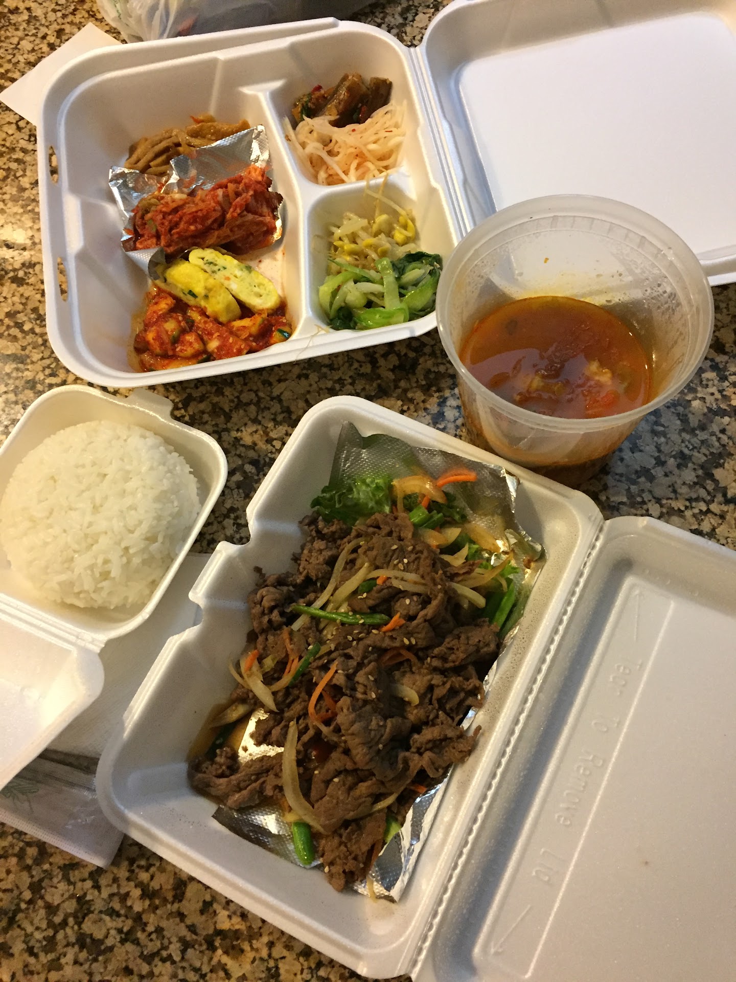 I was greeted very warmly when I first opened the door. The inside of the restaurant is very clean and set up for dine-in, however I requested take out, and was immediately assisted with my takeout order. Korean food is meant to be enjoyed in groups, so the menu pricing is based on the servings being for more than one, etc. If you order a single combo, look to pay something like $15-20 for all the fixings. I ordered the Bulgogi Beef Combo and my food came in less than 10 minutes and then I was out the door.