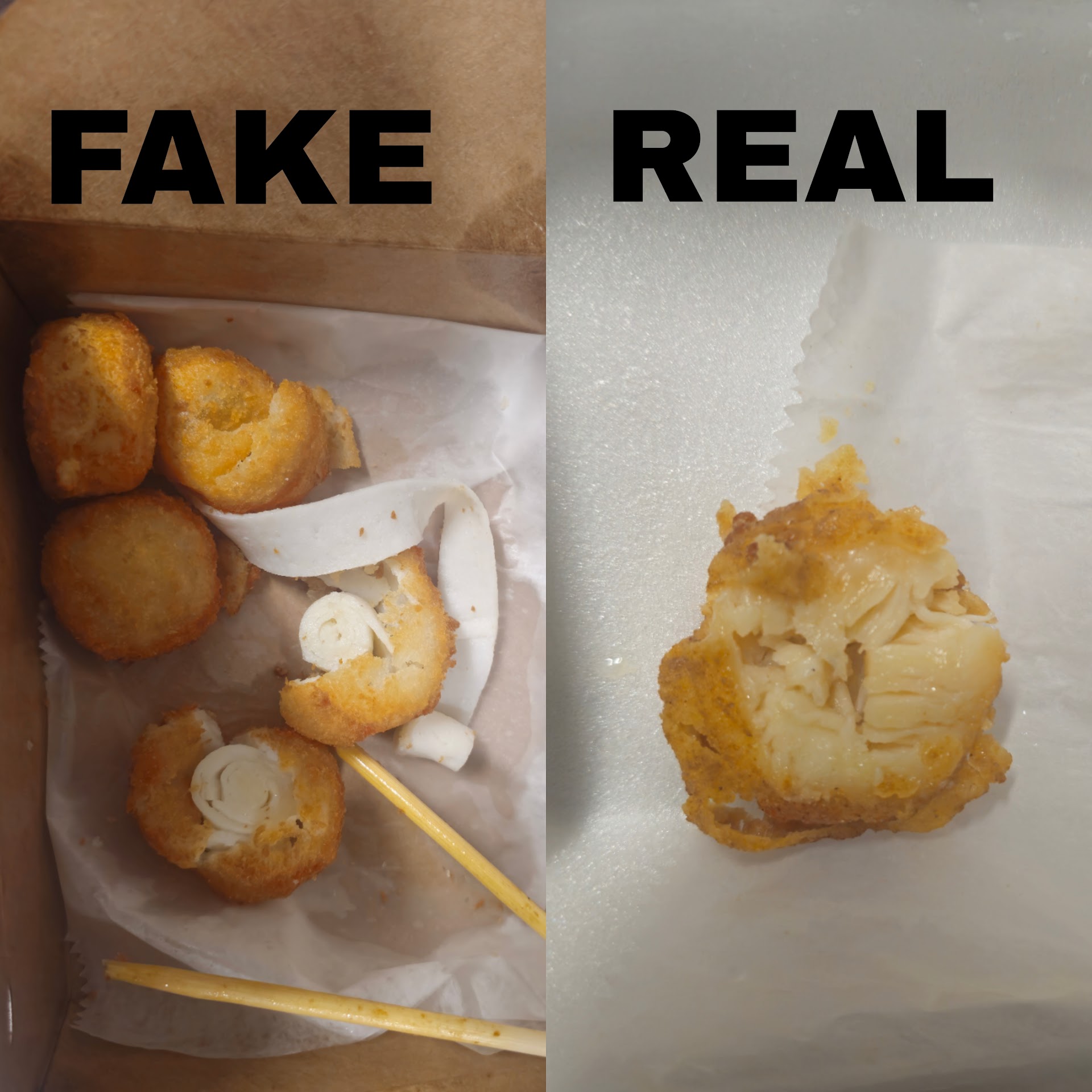 They already don't look great when you get them which was the first sign of trouble for me but after eating one I was disgusted. I'm from the coast and seafood is my favorite and I immediately knew something was off. So I took the breading off one and I still cannot explain what I saw.