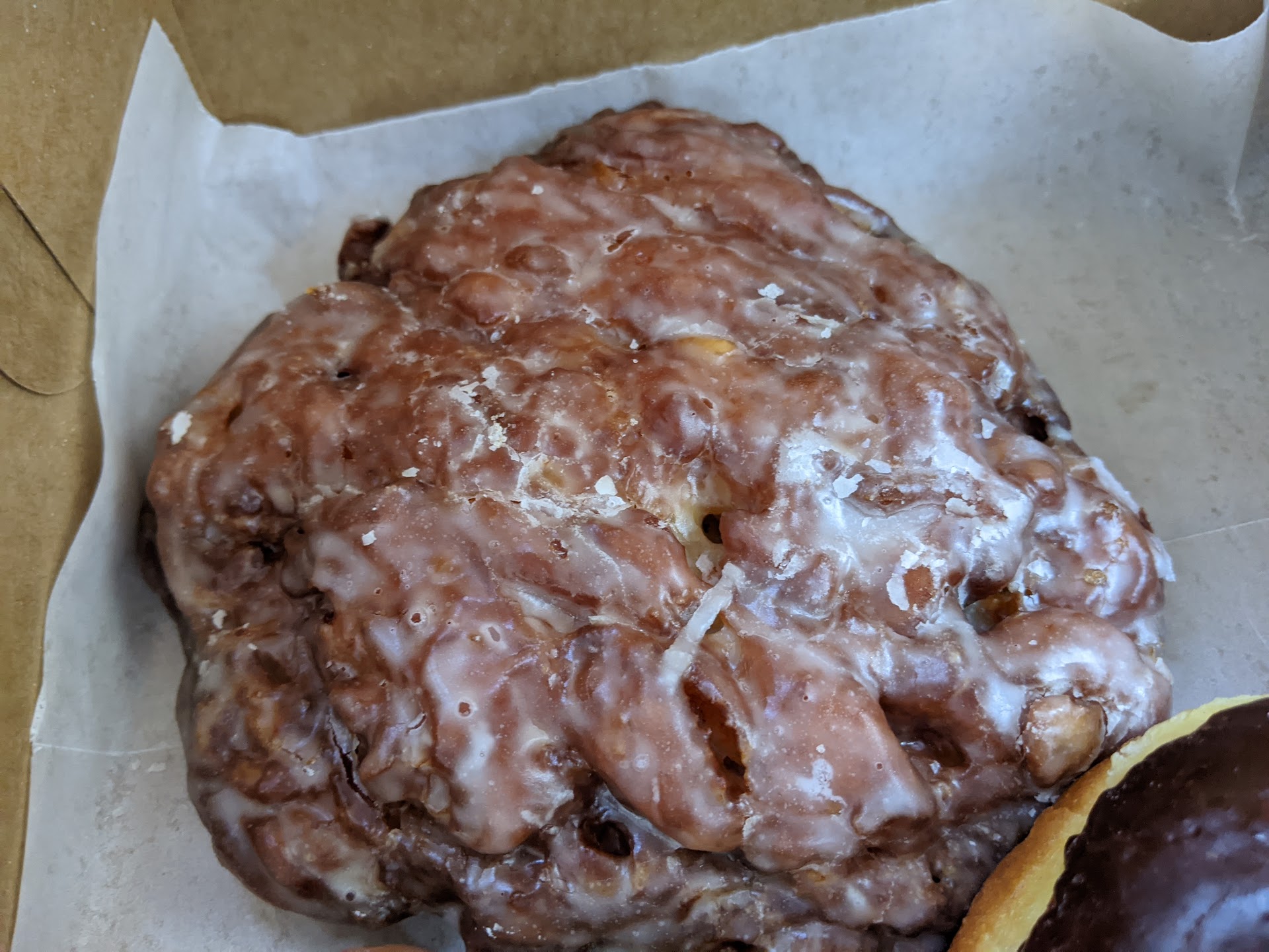 The apple fritter is big. Like jumbo big. Like two meals big. Flavor wise it's a bit of a sugary monster, and the apple isn't as strong as it could be. Spices are okay, the cinnamon smooth and strong. Would've liked more apples. Outside is crispy, inside is a bit mushy. Value wise I can't really see you getting more calories for the price. Overall, while a colossal donut, definitely not a star donut.
