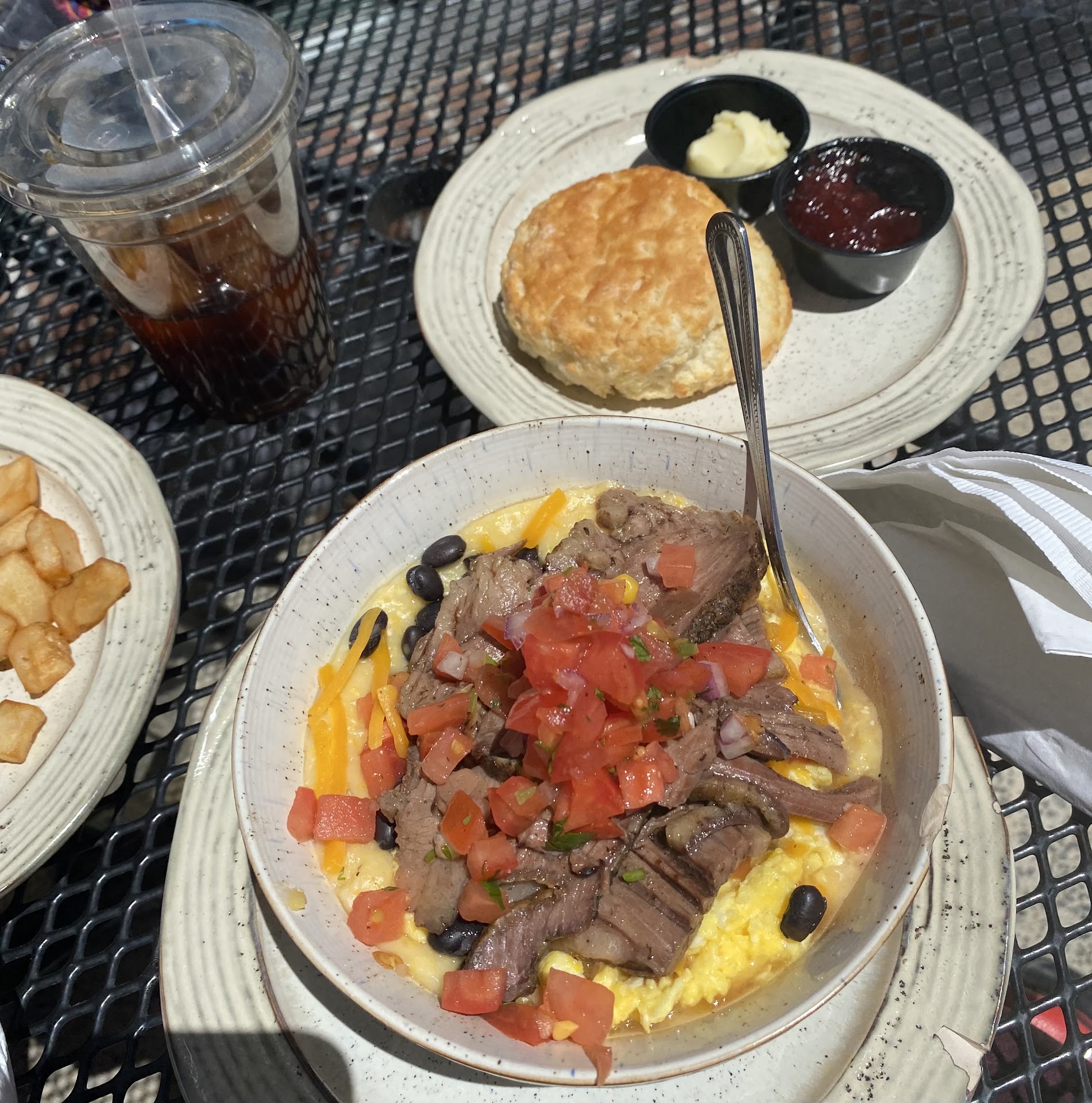 I ordered the cowgirl bowl, and a buttermilk biscuit. The grits were a little more “wet” than I prefer, but it wasn’t packed with flavor, but it was good. The meat was cooked perfectly. The biscuit was phenomenal. I had the iced rocket fuel to drink, no cream or sugar added, it had coffee ice cubes which is fun, but it didn’t have a very strong flavor. Average as far as iced coffee goes.