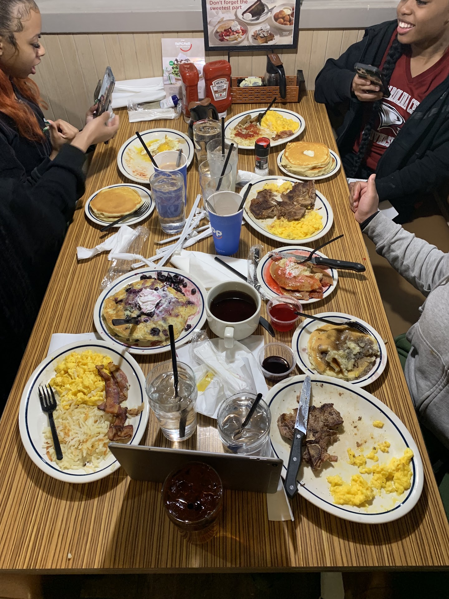 Read moreI am going to start off by saying I rarely leave negative reviews and I don't complain often but I just left the Durham NC I Hop and I have to say I was far from impressed. I have an 8 year old daughter who uses forearm crutches to walk. Now it was raining today and I did expect to have some issues with the floors being wet and slick but she literally fell 5 times while we were in the restaurant walking to our table and leaving. Apart from the entrance being wet with no signs placed out to note a wet floor, the walking floor was also crazy slick. I almost fell myself. I also noted a gentleman in the same area with us, who had 3 small children that also almost fell due to the floors being so slick. They looked clean and they were not wet but something was causing them to be very slick. We have been to this location before with no problems at all. I could see the wet floor signs available but they weren't being used. On the way leaving is where she fell the worst. She fell very hard on her behind and at this point I felt the need to let people know. If you have a disability and plan on eating here. please please take precautions so you don't fall, especially if you use any type of crutches. My daughter slipped on the way back to our table from the restroom and one of the gentleman servers helped me pick her up and walk her to the table. While the food was very good, our service was far from impressive. The place was not busy, and we had met a friend and her son to have a birthday lunch. The food was good but we weren't brought syrup and once our food was served, she only came back to bring the bill. I ended up finding syrup on another table. There was a gentleman bussing tables who was actually one of the nicest people and helped us during our visit, so it wasn't all bad. I also did make a point to personally tip him and let him know he was appreciated. Again, I just don't want anyone to get hurt, thus my review. The food...