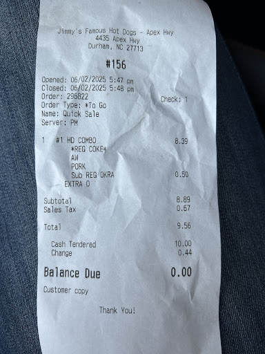 Read moreThe Highway 55 location I would not recommend for anybody to eat. This explains why no customers was at this location at 5:47pm today June 2, 2025. Since they are suppose to be hot dogs specially, I would not recommend anything else to eat at this location. This was my first time visiting this location for hot dogs. I ordered the #1- 2 hot dogs with side of fried okra and tea. Paid 9.56 This was the worst meal I have ever had in the City of Durham for hot dogs. The okra was fried to a burnt crisp, hot dog tasted as if it had been sitting in water too long which didn’t have a hot dog flavor, chilli was dry, the slaw seem soggy with an onion mixture taste. The cashier asked if I wanted my change, then had to count out .44 twice then told me to make sure she gave me the correct change. I called back to talk with a manager on duty. None was there and the young lady was not sure when a manager would be at the location for me to discuss this meal. It was definitely not worth $10. Therefore, go down the street to another restaurant to get a better meal from...