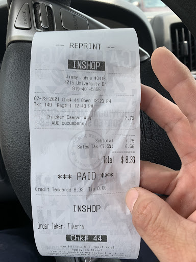 Read moreTonight I tried the jimmy johns near 15-501. The restaurant is clean and empty. The workers this evening didn’t have great customer service. The guy making sandwiches never acknowledge me. The woman at the cash register tried to answer me with as few words as possible. No smile. I ordered a giant veggie sandwhich which is over $10 and the sandwhich wasn’t cut. The avacode was barely on my sub and I tasted no vinegar. I asked to get the vinegar on the side but she said that’s not possible but when I asked to put the ranch on the sub she hands me a side container of ranch. I asked for the sub to go and she handed me the sub unbagged. Seriously, terrible customer service. I threw my sub away because it was not what I ordered. Please do not go here unless you like supporting bad customer service. I will never...