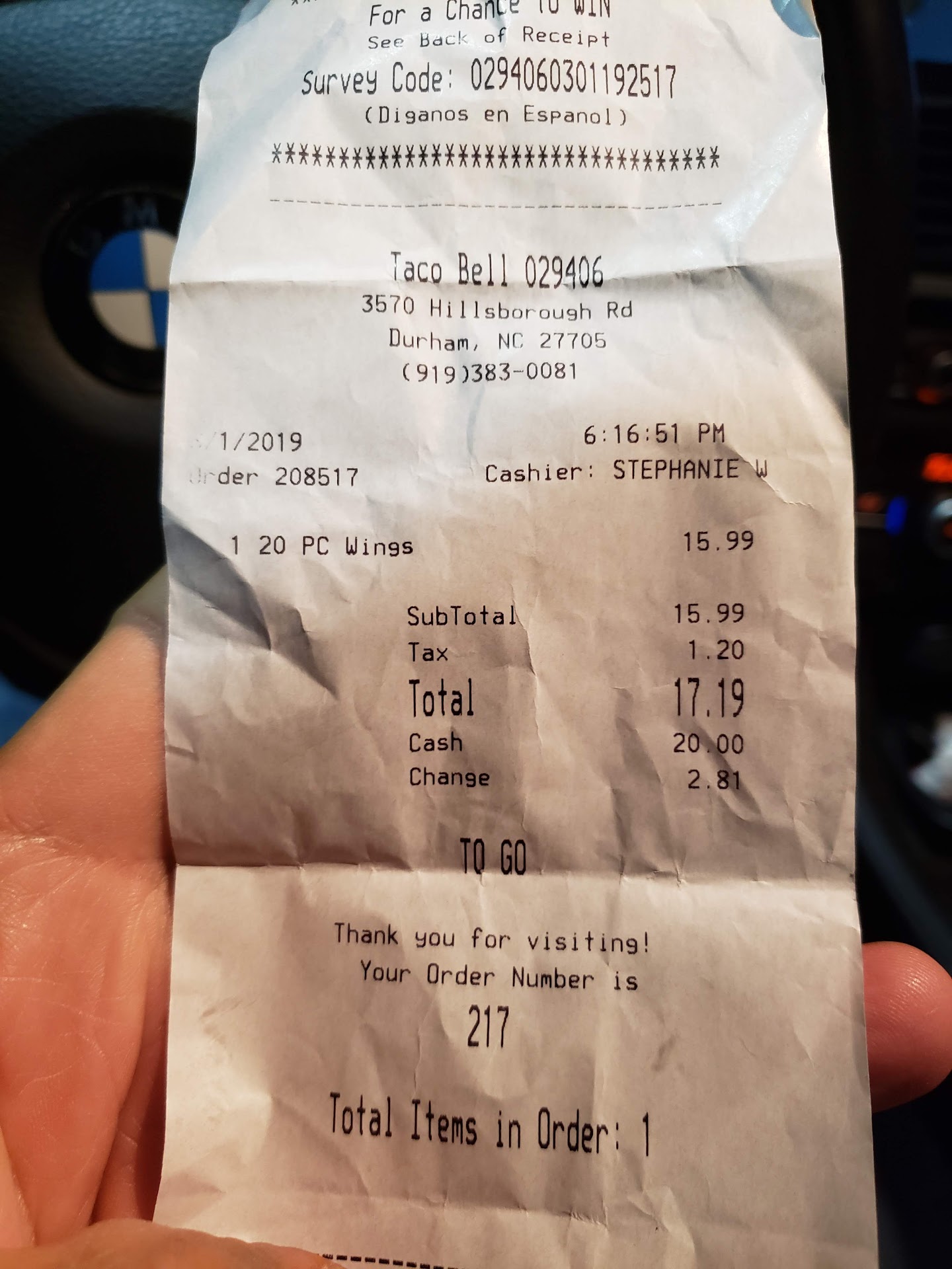 So for this 17 pieces of wing, I paid with cash $17.19, almost a dollar each. I would call credit card company for money back if I use...
