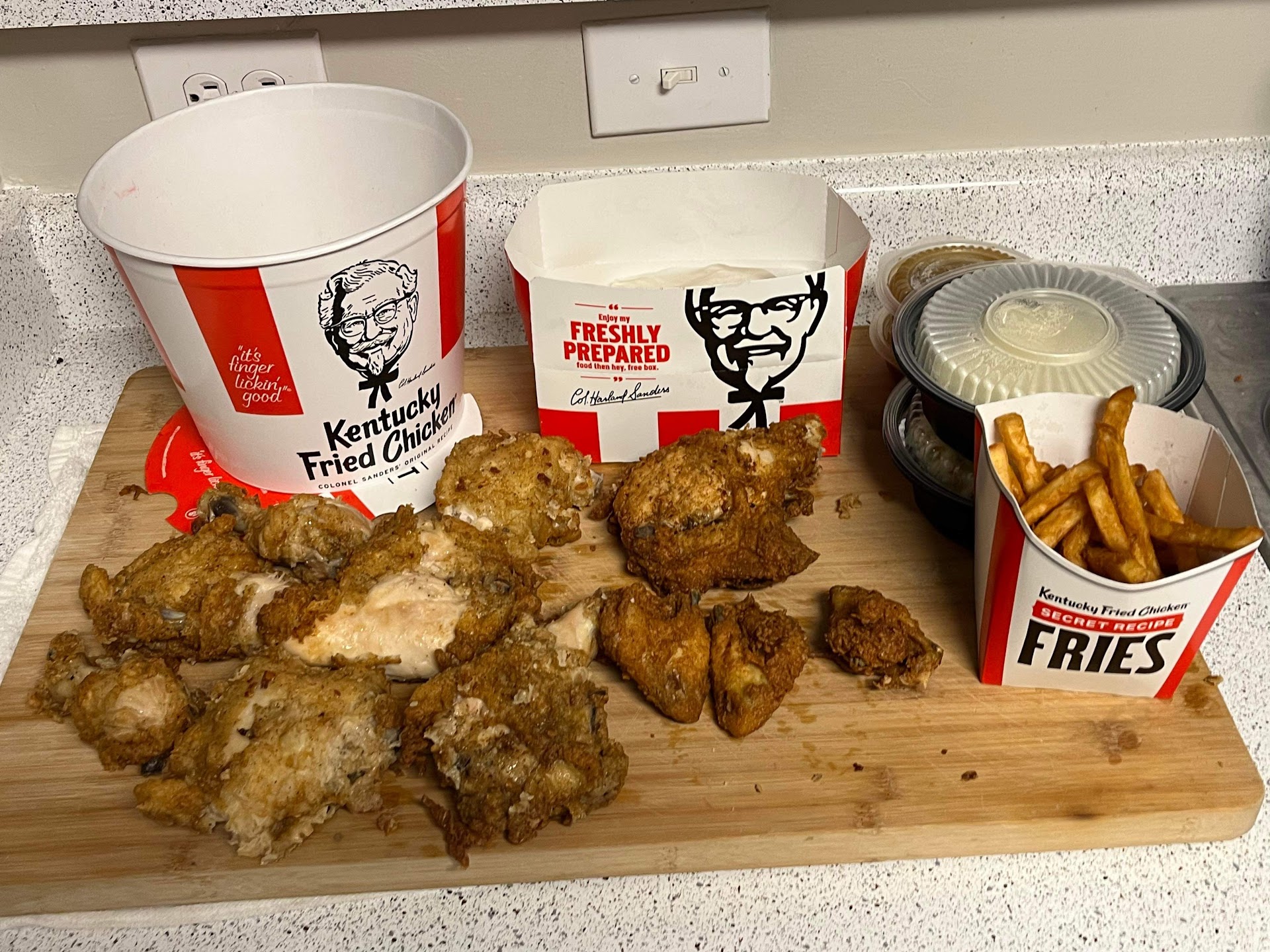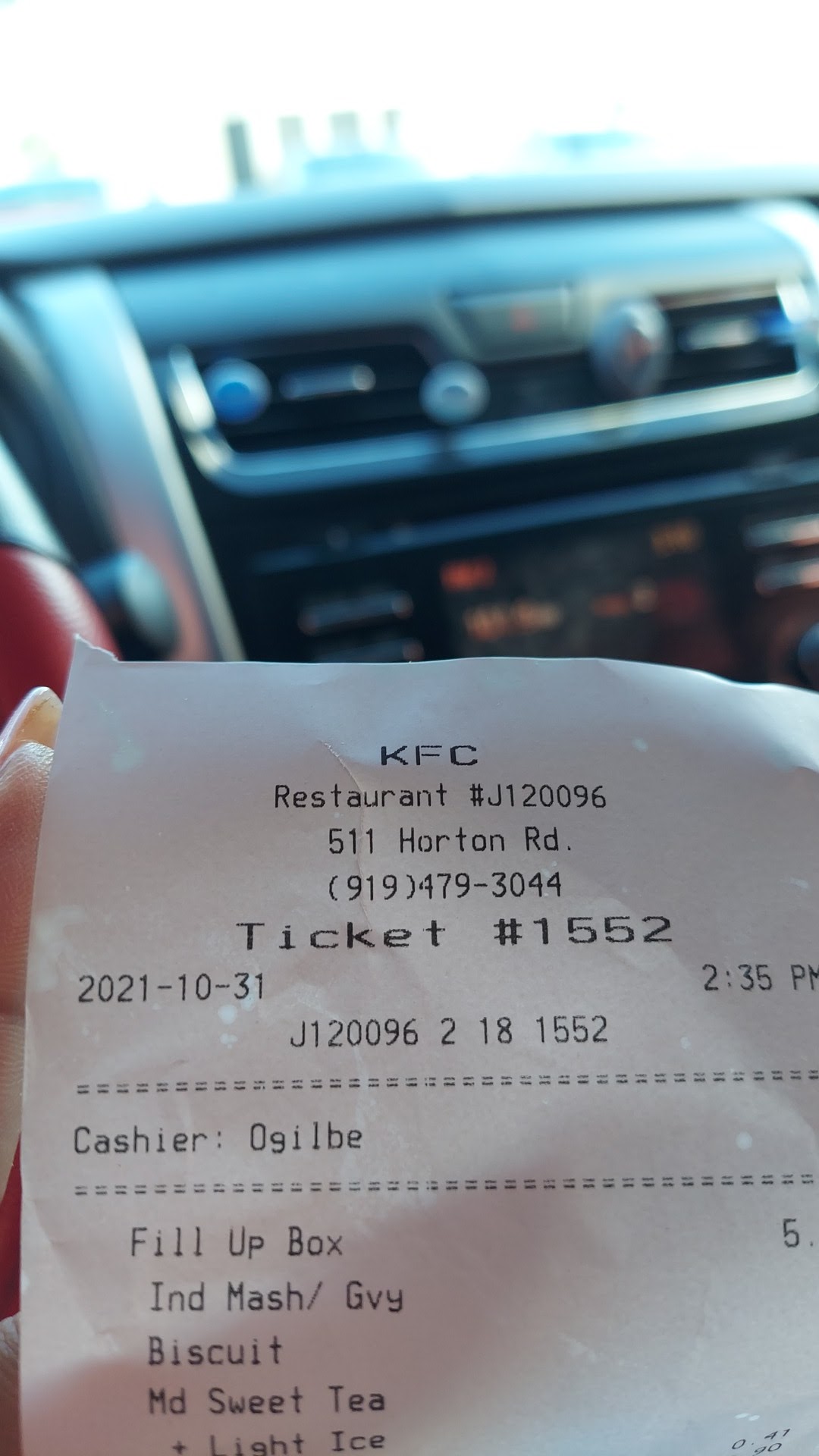Read moreI placed an order online around 1930 and arrived at the store at 1945 and noticed that all of the lights were off as if the store was closed. I walked in and there was one staff member at the drive through on his phone with a line of 3 cars just sitting in the drive through. Once the staff member noticed me he told me that they are closed and I said âwell I was somehow able to put in an online order for this location and am supposed to pick it up at 2000â. Two more staff members walked out of an office and one of them told the original staff member to lock the door. The service just got worse and worse as more people came in complaining and returning orders before the staff got a chance to lock the door. The staff members were cursing and just being rude to other customers. I heard the staff say that they didnât have enough chicken to fill my order so a more senior staff member came over and grabbed a bunch of random chicken to throw in my bucket. Once I got home I check the chicken and most of it looked as if it had been picked over by Eric Cartman. I...