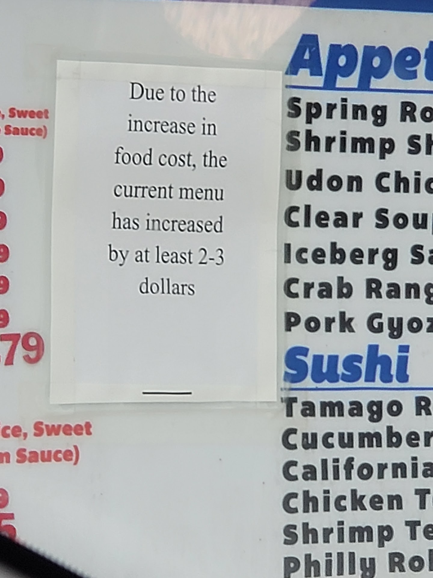 6 years ago, I could get 2x Sushi rolls for $9.99 (+1$ for Dragon Roll) and now, those same 2 rolls cost $13.99, while rolls designated as "special" cost $18.99 š (that's literally double the price!!).