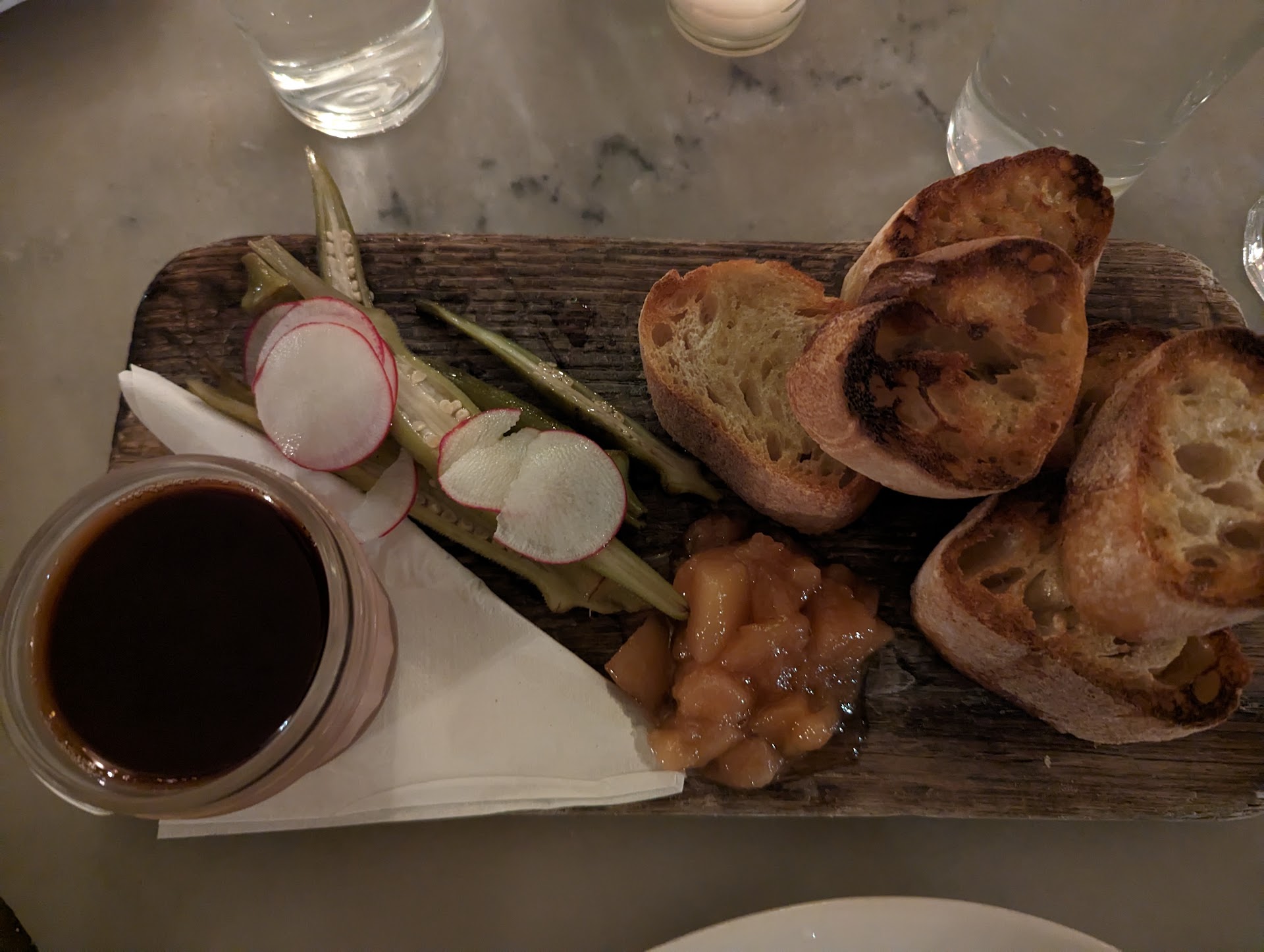 Paté - rich with a sort of reduction jelly on top that made a sweet and fatty-rich combo pop on top of a yeasty, tasty toasted bread.