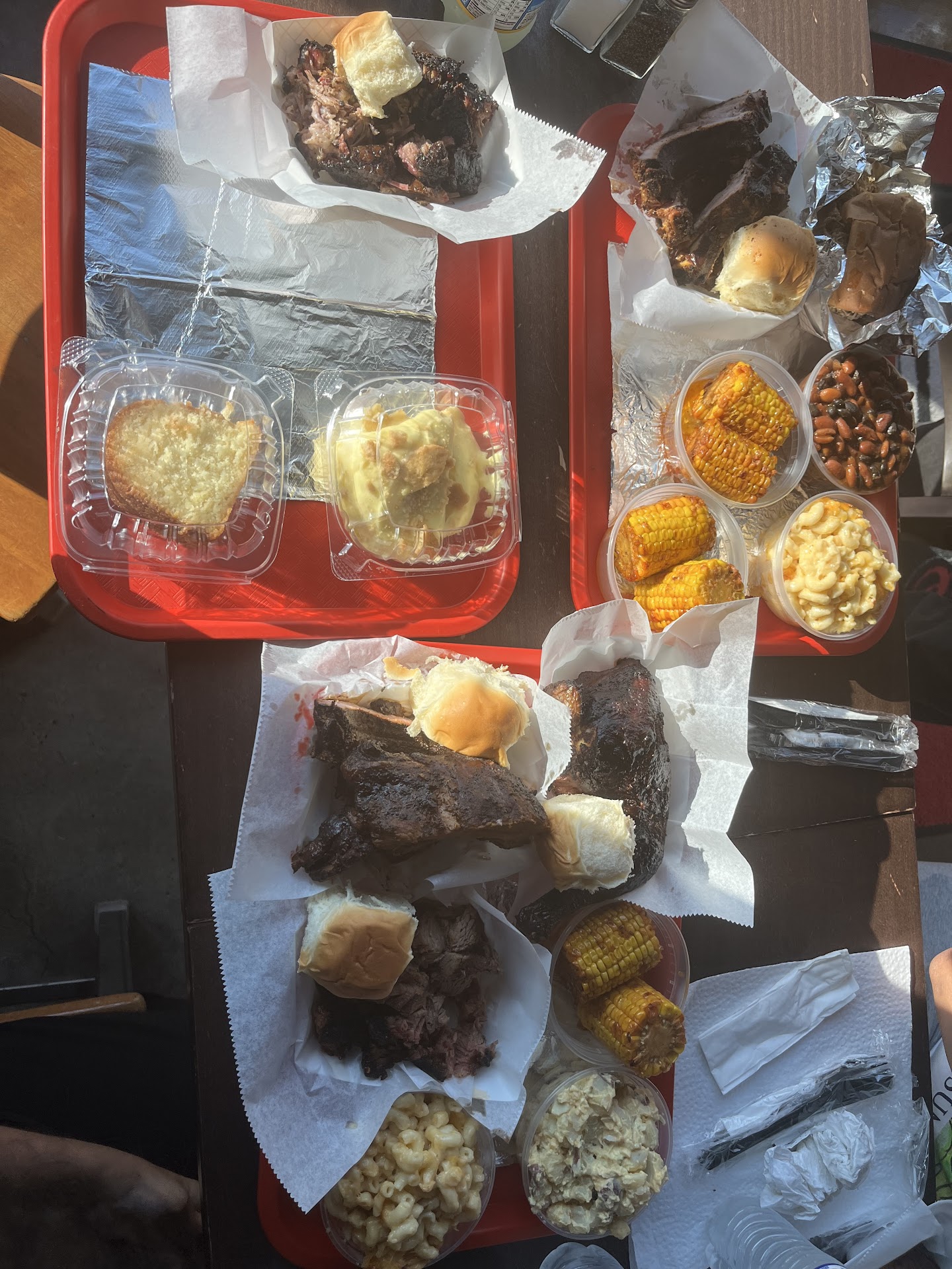 The Food: When our trays arrived at the table, everyoneâs eyes widened. You know the saying about your eyes being bigger than your stomach? That was us, and we didnât regret it. Here's the lineup: brisket, leg quarter, ribs, smoked corn, potato salad, beans, a shredded pork sandwich, and mac and cheese.