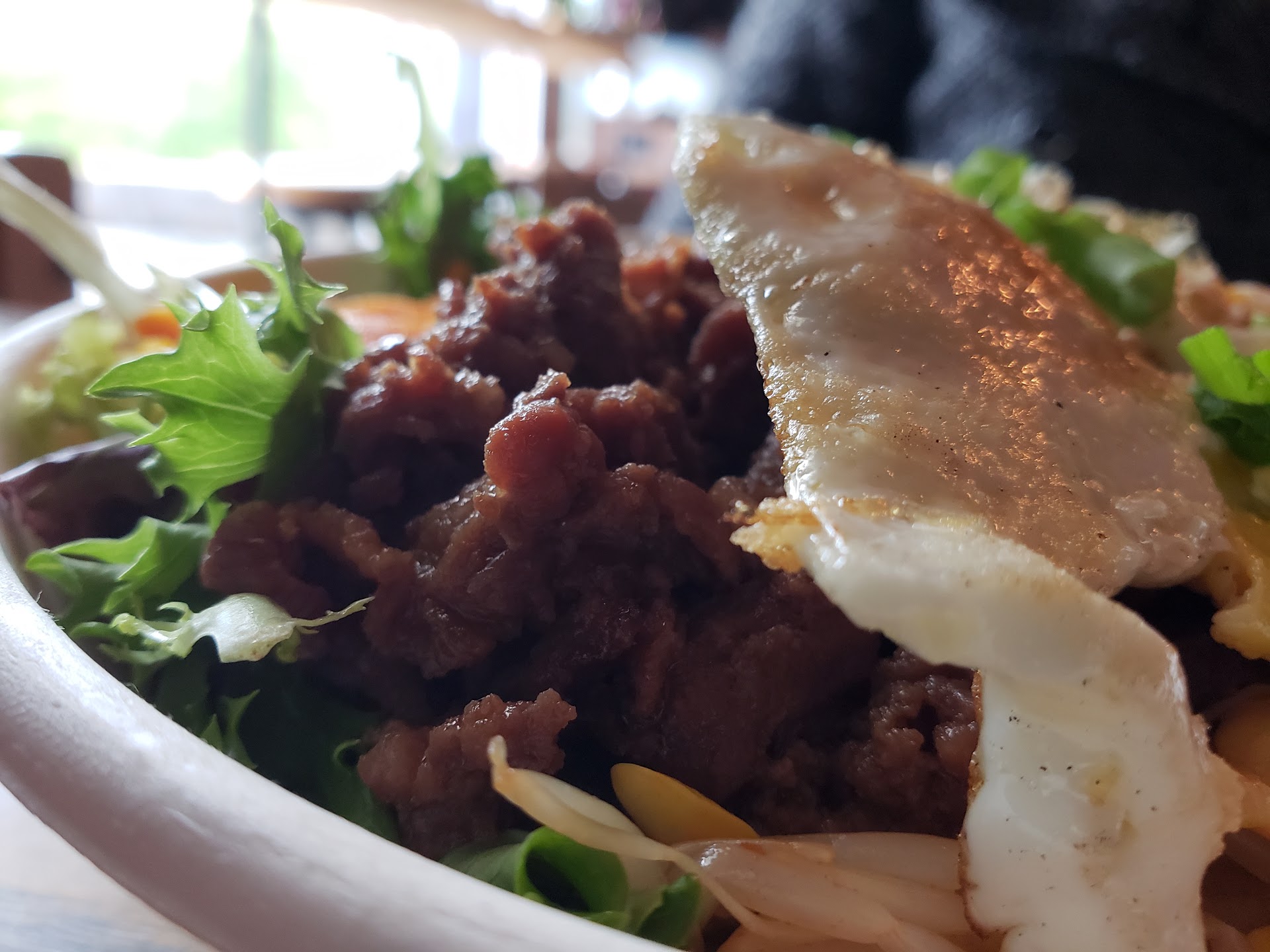 I scanned the QR code on our table with my Iphone & thought the whole ordering process went smoothly. I ordered the Bibimbap which, based on the description, was Korean BBQ with chilled veggies, fried rice & topped with egg. My girl ordered the Joe's Special, which was Korean BBQ served over white rice, japchae & spring mix. Their base prices were $15.50 for the Bibimbap & $19.25 for the Joe's Special. However, we still had to add the protein: +$2.50 for beef on Bibimbap & +$1 for Spicy Pork. The description of the base order said it included Korean BBQ but to add the "BBQ" part, we still had to pay extra?!