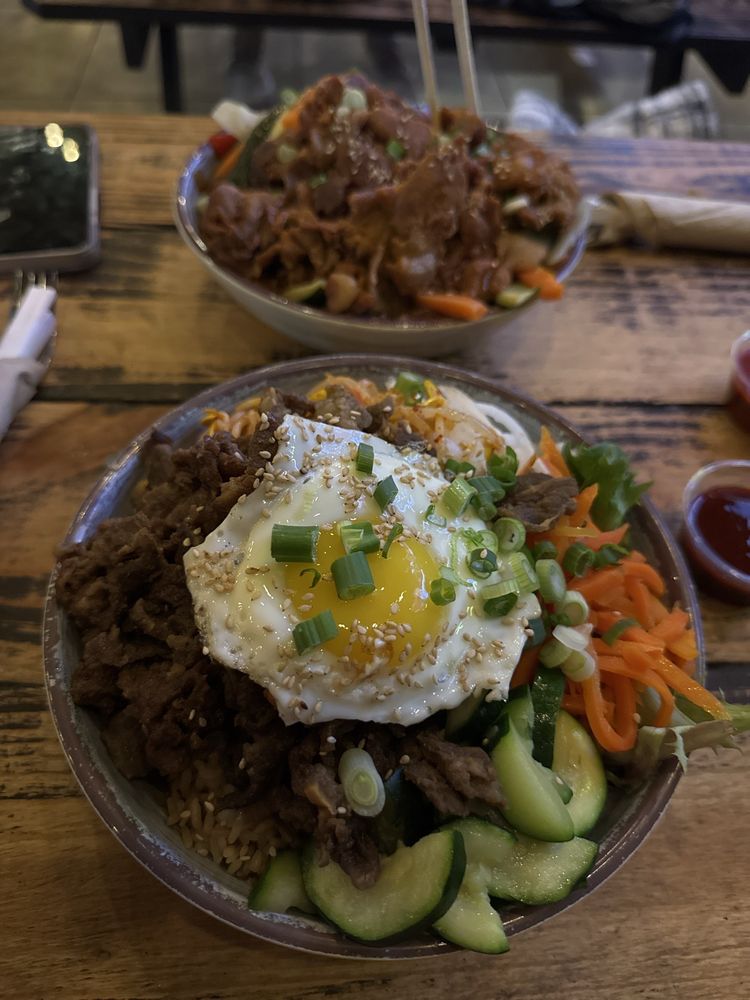 Enjoyable Bibimbap & other healthy Korean food Various sauces add flavors well QR code on each table makes it easy to order Wonderful indoor & outdoor ambiance Ridiculous service fees for what exactly? Overpriced food Canned soda for $2.50