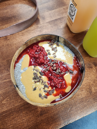 Great atmosphere. Love the mural on the wall, and love the book exchange. My girlfriend LOVED the music ā¼ļø. I love the amount of gluten free, vegan, and sugar free options. I also love how environmentally friendly they are. The coffee was okay, maybe a 6/10. The Strawberry peanut butter cacao nib toast was a little dry, but overall pretty good, 7/10. Could use a little honey drizzle or something. The bagel with vegan cream cheese was good. I got the berry schmear. It was good, couldāve been spread more evenly, the berries were a good pop of sweetness, without added sugar. My āAƧaĆ you at the finish line ā was very good, a little tart, but I like thatš. The watermelon juice was expensive, but really good. We understand that the eco friendly packaging and the fact that itās made in house raises the prices. The juice bottles however , didnāt close š¬