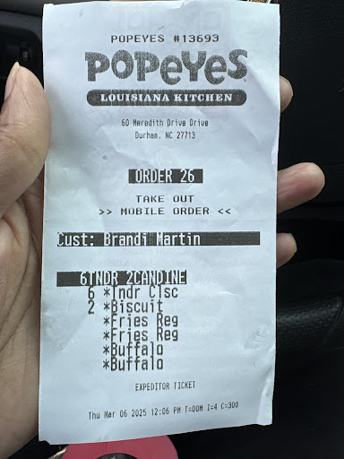 We had a $20 Popeye’s gift card that a family member had purchased as a gift for us from another Popeye’s location in the Triangle area. Even though we had the receipt to prove the balance on the card, they refused to acknowledge it.