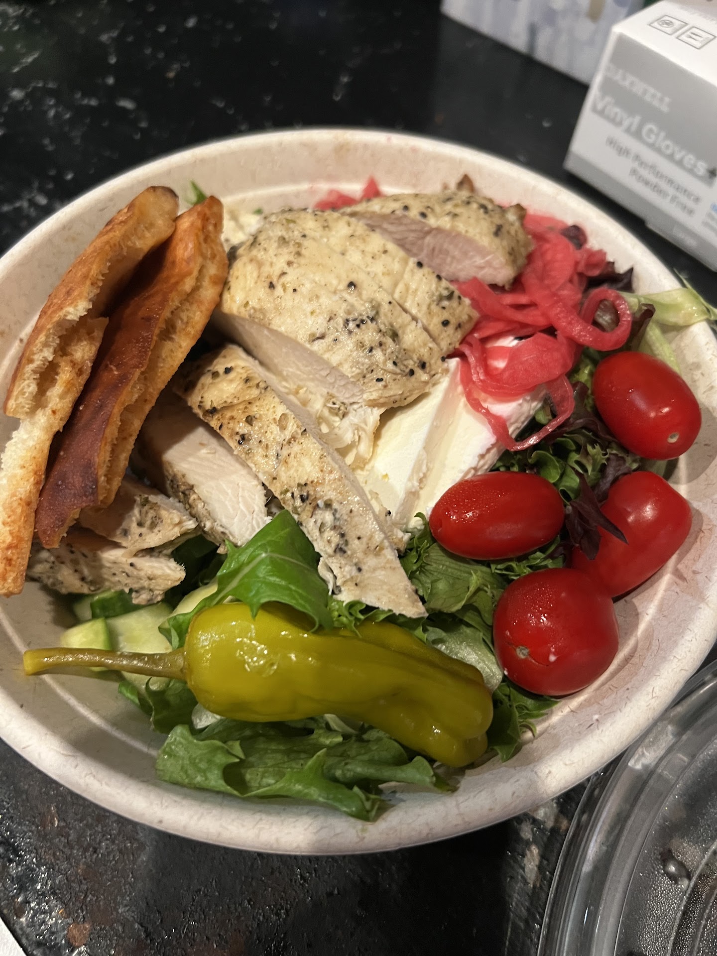 The evening staff (white and black girl) can be a bit rude. The white girl was handling a customer's phone at the register because his gift card wasn't working, and it was on his phone. When she was done with him, she went to reach for my food. I asked her to let the other girl get the food since she had just finished at the register and was handling a customer's phone. She became offended, and I explained to her that she had just finished handling a customer's mobile phone, and I'm uncomfortable with her handling my food without first washing her hands. She became offended again, and I said, "I think it's a reasonable and standard practice at a restaurant to wash your hands between handling cash or other objects, and then handling food. Mobile phones harbor a lot of germs." She then went to wash her hands and put on gloves while the black girl scooped my hummus. Then, the white and black girl arrived at the station where the food was at the same time and the white girl threw her hands up in the air with her palms spread as if to gesture, "I'm not touching it." I just shook my head at her passive agressiveness.