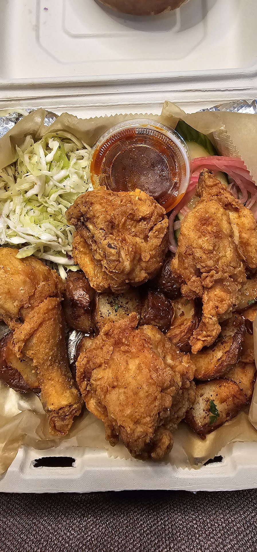 Catfish (Farm-raised spread filet, light breading) Smoked brisket with smash potatoes Fried shrimp with a spicy remoulade-style sauce Broiled broccoli with shaved cheese and lemon