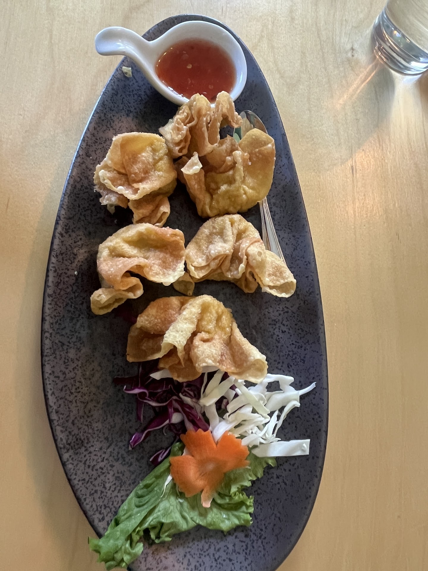 Puffer Crab Wonton: 7.2/10 These wontons are notable for their unique incorporation of curry, delivering a bold flavor that complements the extremely crispy and flaky texture, making them a standout appetizer.