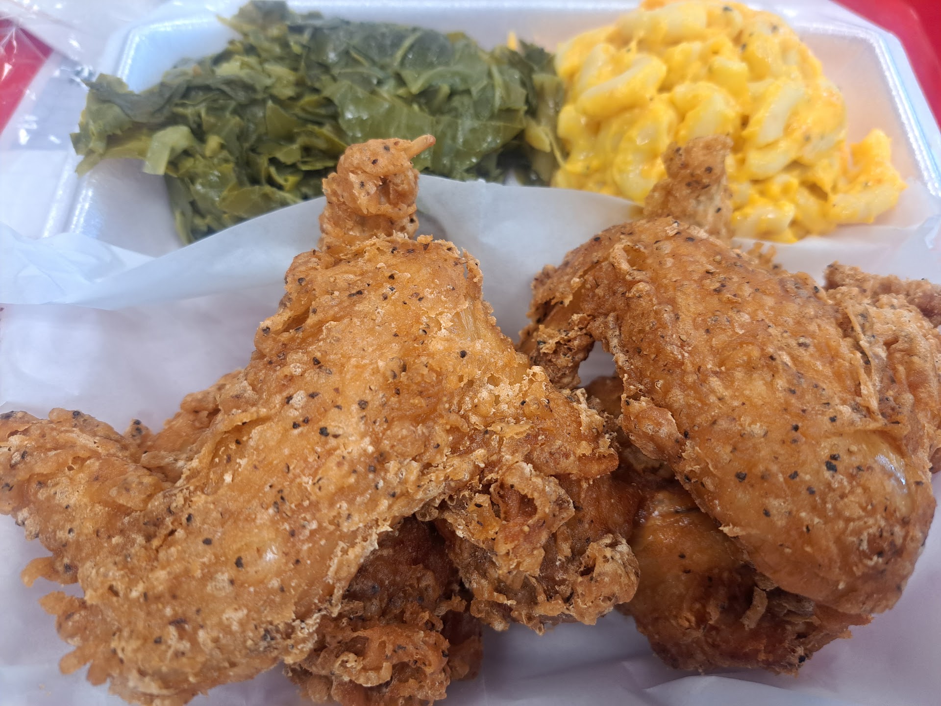 When you walk in there is a counter in front and a dining area to the right. You are to proceed to the dining area and join the line. There is no printed menu and the staff taking your order were extremely patient and welcoming, despite being slammed. They make fried chicken to order so it will be about 20-25 before you food is ready. They had other options if you’re pressed for time: baked chicken, baked spaghetti, BBQ ribs, and more. Your box (essentially a plate meal) comes with 2 sides of your choice (we did mac n cheese each, fried okra, and collards), along with a roll or hush puppies.