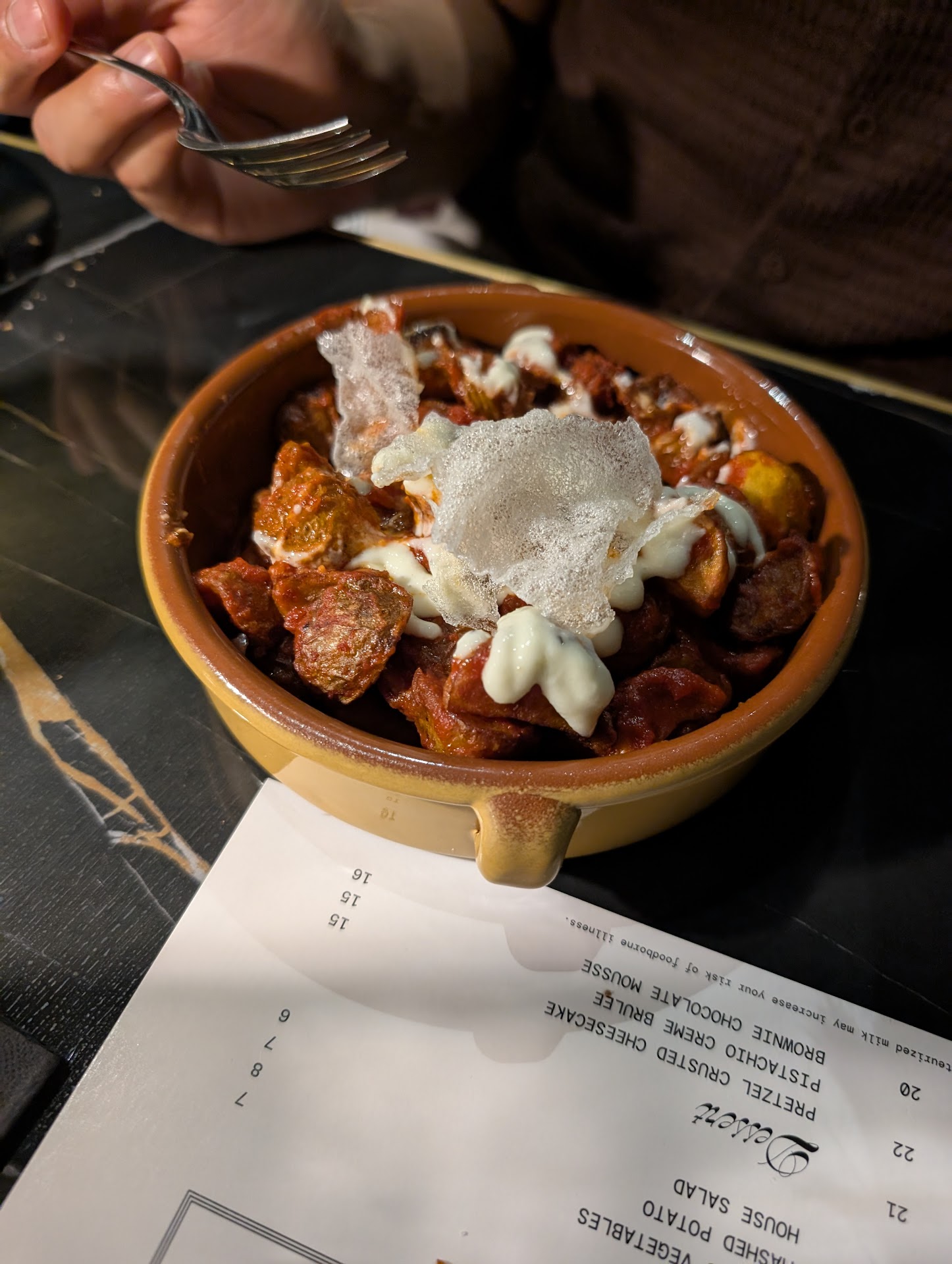 Gambas al Ajillo- I wanted to love this item as it was packed with shrimp. But also, there was a huge helping of some garlic-like white foam served with the dish that just threw things off. The taste was too much, and I'm not sure if it was a garlic whip or cheese foam? Either way, it was weird. 3/5