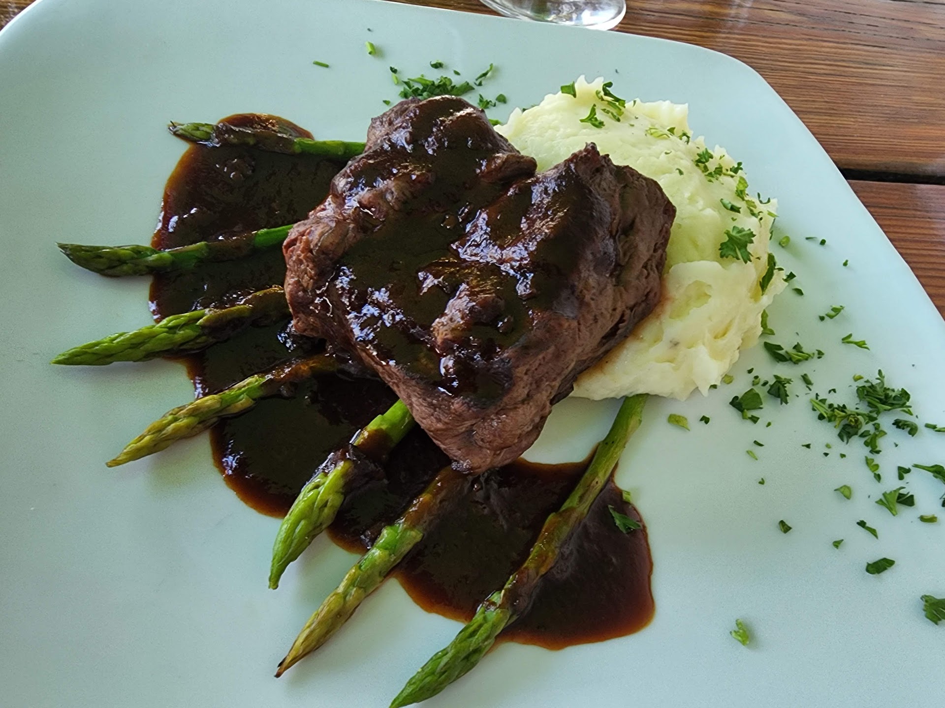 My steak was a little over-done on just one side, but the serving amount was just right. I felt satisfied without feeling bloated. The mashed potatoes were smooth without being a pile of gluten. The green beans were cooked, but still a bit crispy. I need to add salt and pepper to my dinner, but what a nice change to have a meal served with too little salt than too much. My wife said the crabcakes were very good rather rich as they had a lot of crab meat in them, versus being mostly filling.