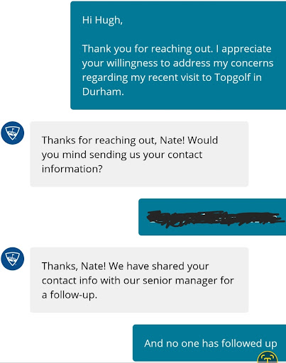 Read moreThis was a horrible experience and we wonât be back! My daughter turned 17 yesterday & she only wanted to come to Topgolf for 1 hour & celebrate. We get there at 6:30pm and are told it is between an hour to an hour and a half wait on a Thursday because apparently golf is half price, ok fine we get on the list I have the balloons, cake and gift as well and we are told sit over in the restaurant area. My husband & kids sit to the bar to order because we were told there is no waiter to take orders. So then at 7:20 I go back to guest services to let them know my husband has been waiting to order food 40 mins. She said have you been sitting to bar I pointed to my husband and my kids showed her yes they have been sitting there. Then a guy with a red shirt all of a sudden takes our order and she says youâre in good hands thatâs the manager and she proceeds back to guest services laughing and playing with the others. At this point my daughterâs cake is melting I had to uncover it at the restaurant area because it was then 7:40pm and we still had not been given our food or taken to golf. I went back to guest services and said hey we will take any golf size station as I watched empty stations for at least 30 mins of our waiting time. Still nothing so at approximately 7:55pm we still had no appetizers or anything just the drinks we ordered. My kids are starving, my daughter whoâs birthday it was is in tears all she wanted to do was golf a little. So we tell the guy with red shirt box food we are leaving, the brought empty boxes to the table we still had no food. He then apologized and took food off the bill and only charged us for 2 drinks. I walk the melting cake to the car while my husband handles the bill for drinks. You would think either guest services or the manager would have seen the tears in my daughters eyes and at this point my eyes as we are leaving again itâs now 8pm not only did we wait the time we were told we never got anything to eat in between that wait time. But nope they were very dismissive, I really think we were pre judged by the color of our skin or maybe the color of my wig. Not 1 white family got turned away in that time I was there. Itâs really sad and upsetting.The as soon as we load up in the truck to leave at 8:01 it says you bay is ready. If that were the case why let us pack all the stuff up and leave. As if guest services people standing around playing in between customers didnât see me walking back and forth taking things to the car. I mean no solution was offered, we would have paid for a suite or anything. Nothing was even offered I guess we look like people who couldnât afford it. I work at duke & our management meeting is today Iâm going to let them know top golf Durham shouldnât be an option for us as an organization or our families. We can support Drive Shack Raleigh. Now I understand why this place has only 3 stars. Signed Jennifer G so you...